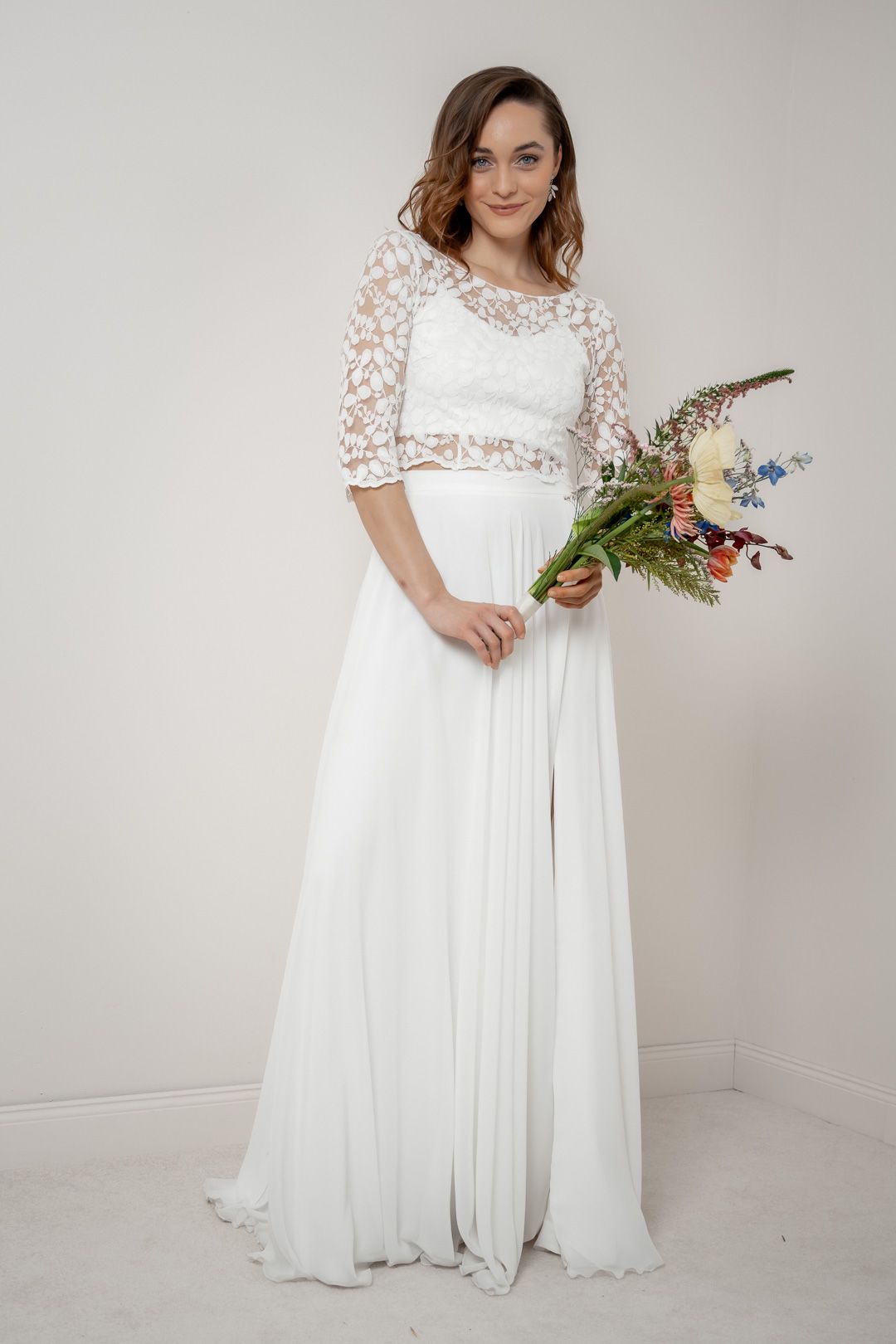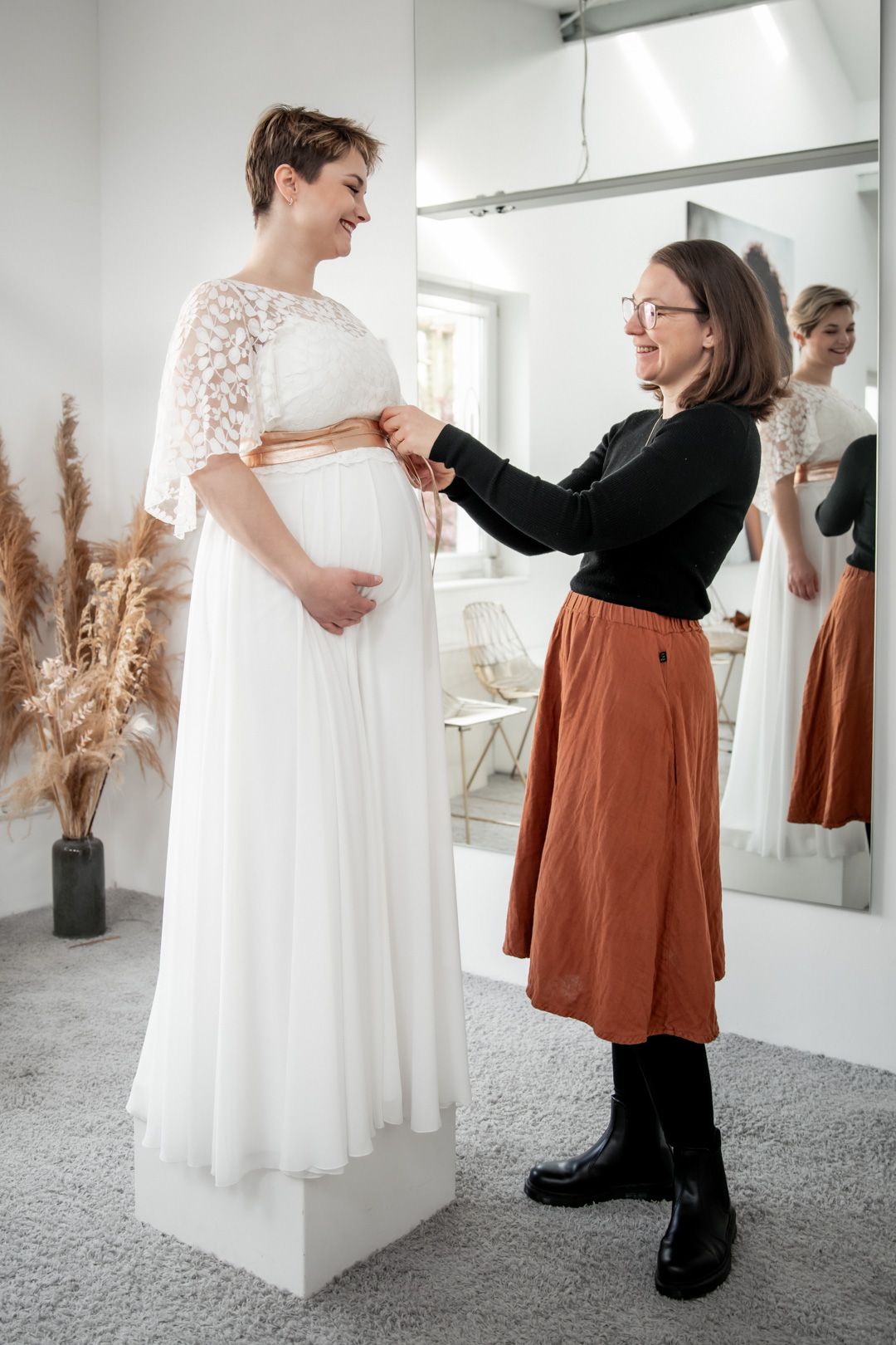 Beratung: Erwähne deine Schwangerschaft bei der Terminvereinbarung (auch wenn du noch in einem frühen Stadium sein solltest). Auch wenn du im Laufe deiner Brautkleidsuche schwanger werden solltest, gib deiner Beraterin im Brautmodengeschäft deiner Wahl Bescheid – so kann das Team gezielt passende Modelle vorbereiten oder auf Änderungen reagieren.