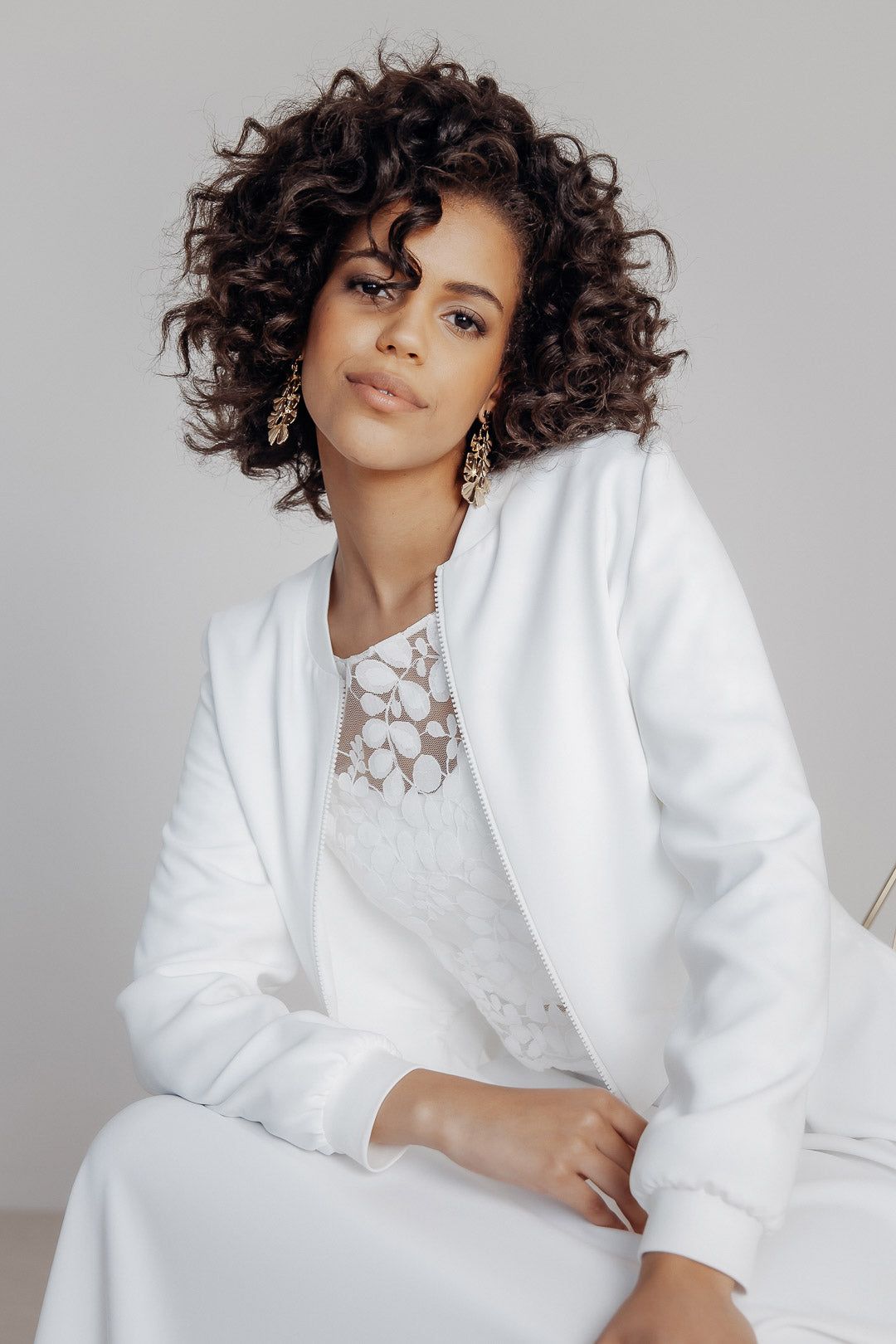 Minimalistische Hochzeitskleider lassen sich besonders gut mit Braut Jacken oder Pullovern kombinieren, die durch klare Silhouetten und leichte Materialien überzeugen. Ideal für einen schlichten Braut Look sind kurze Brautjacken und Blousons aus festem Crêpe, die wie der Rock oder die Hose in der Taille enden, Feinstrick-Cardigans in Ivory oder Blush oder auch elegante Brautblazer, die dem Zweiteiler einen cleanen, urbanen Touch geben.