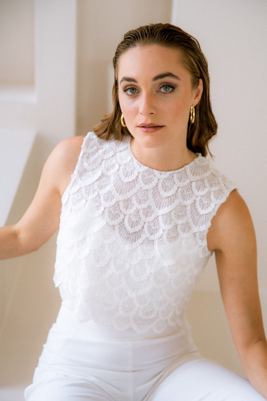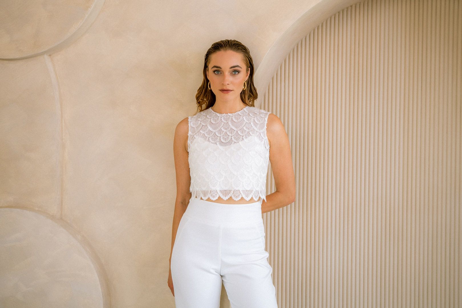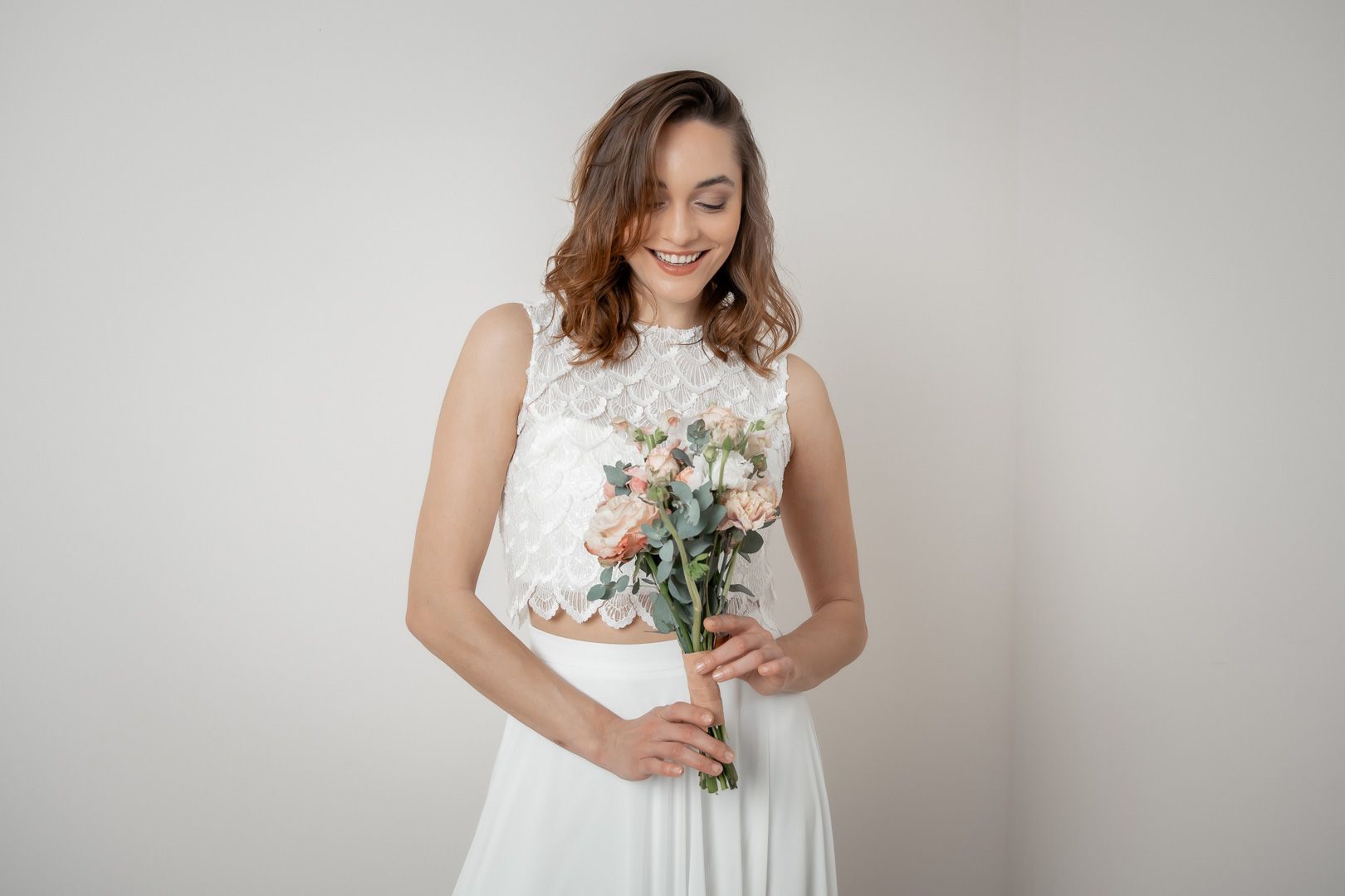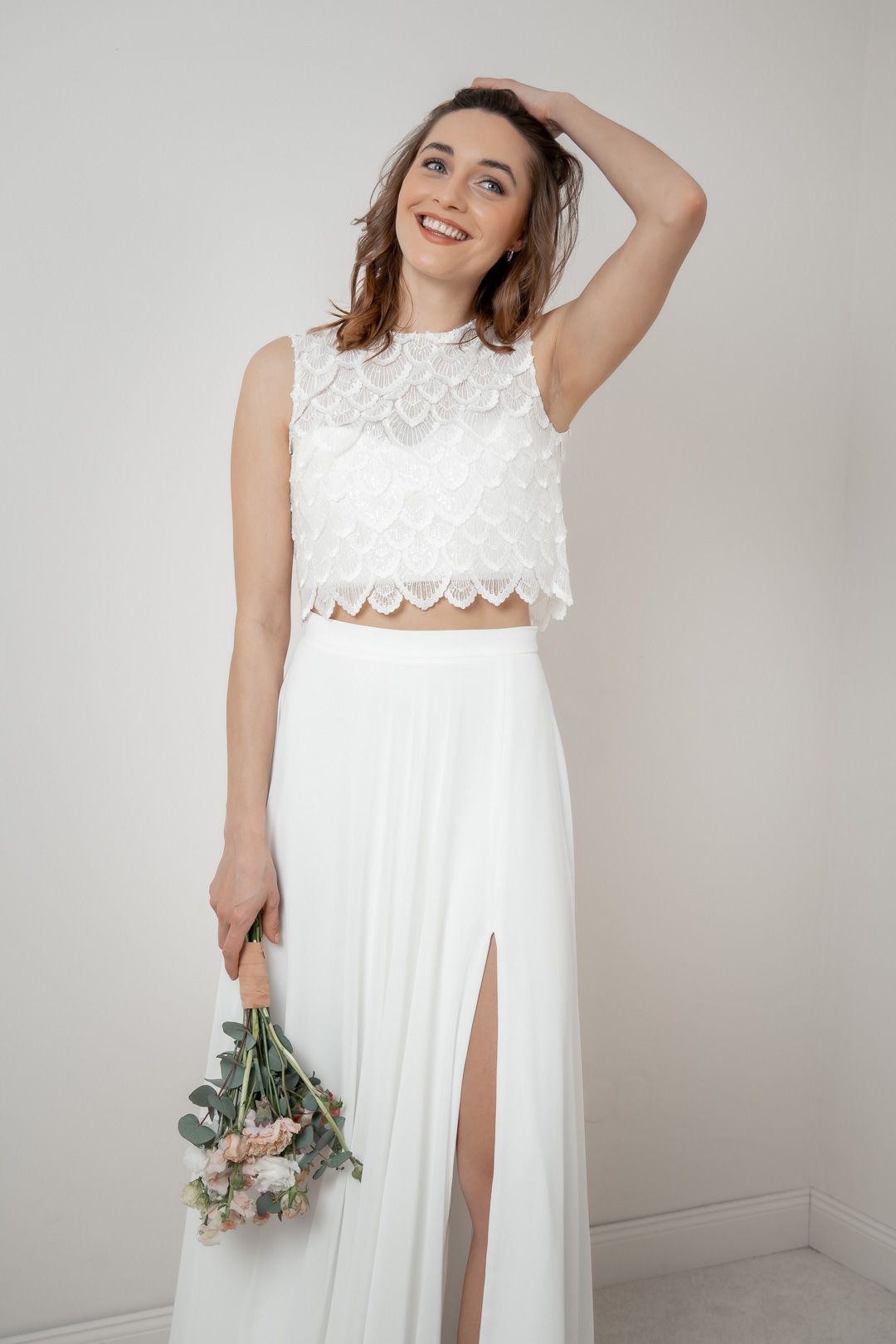 Eske passt gut zu puristischen Röcken und Hosen und lässt sich nach dem großen Tag als Party-Top ausführen.