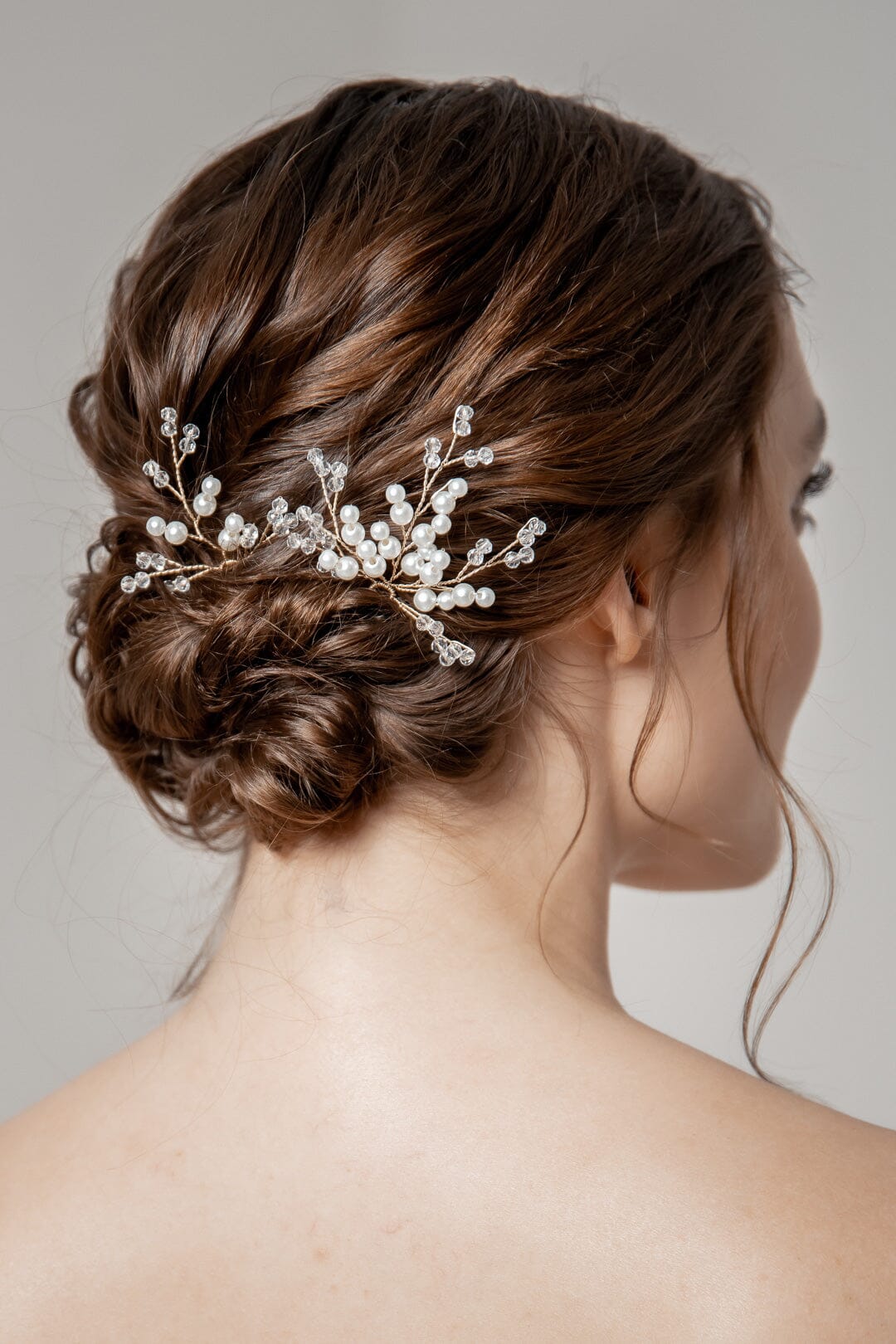Diese sind mit echten oder künstlichen Perlen verziert und verleihen der Frisur einen eleganten und klassischen Touch. Sie sind besonders beliebt bei Bräuten, die einen zeitlosen und romantischen Look anstreben. Es gibt Haarnadeln mit kleinen, weißen Perlen, die in die Hochsteckfrisur integriert werden, um einen dezenten Schimmer und Eleganz zu erzeugen. Ebenfalls beliebt sind Perlenhaarnadeln mit mehreren Perlen unterschiedlicher Größe, die in einem floralen Muster angeordnet sind und somit eine auffälligere und dennoch elegante Verzierung bieten. Perfekt für Kleider mit Perlenapplikationen oder zarten Spitzenbesätzen. - Kristallhaarnadeln