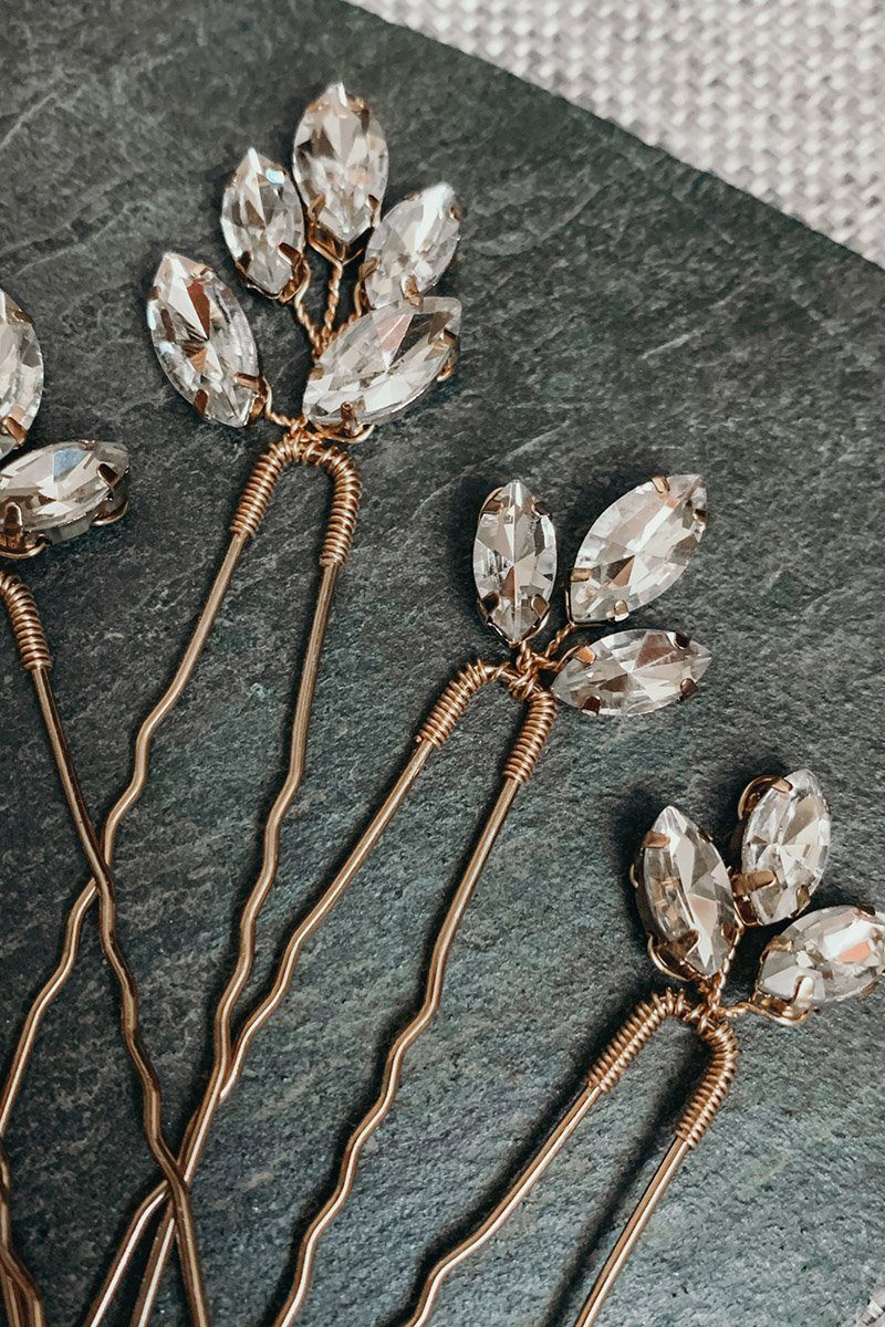 Haarpins mit funkelnden Kristallen oder Strasssteinen besetzt, eignen sich hervorragend, um der Frisur einen glamourösen und strahlenden Akzent zu verleihen. Sie reflektieren das Licht und sorgen für funkelnde Highlights im Haar. Oft gewählte Beispiele sind Haarnadeln mit klaren Kristallen, die in das Haar gesteckt werden, um einen dezenten, aber funkelnden Effekt zu erzielen. Ideal für funkelnde, glitzernde Brautkleider. Kristalle reflektieren das Licht und schaffen eine glamouröse Atmosphäre. - Blumenhaarnadeln