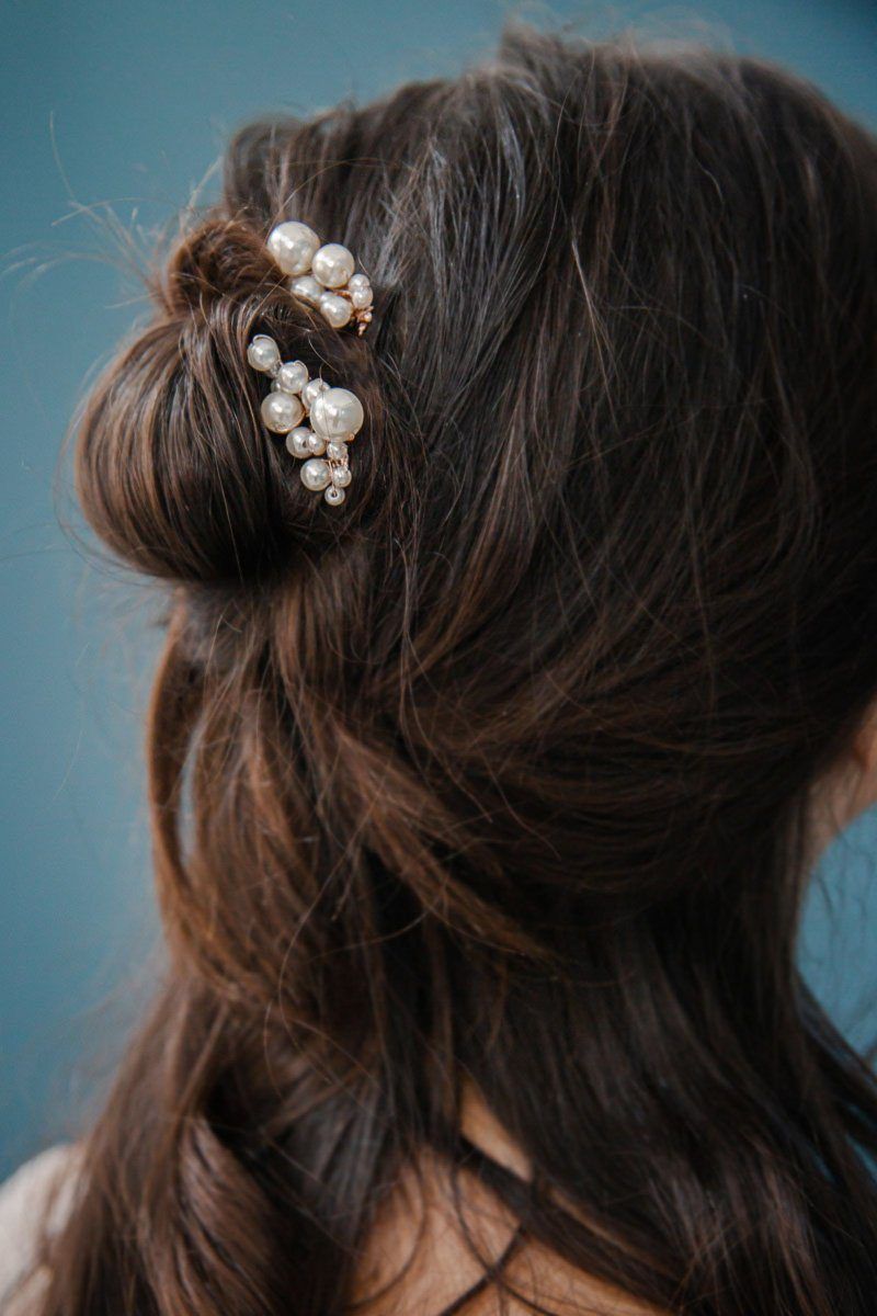 Perlenhaarnadeln, mit echten oder künstlichen Perlen verziert, eignen sich gut zu eleganten Looks, die dabei klassisch, aber nicht zu formell wirken, beispielsweise bei seitlich gesteckten halboffene Locken, bei denen die Perlen das Gesicht umrahmen.