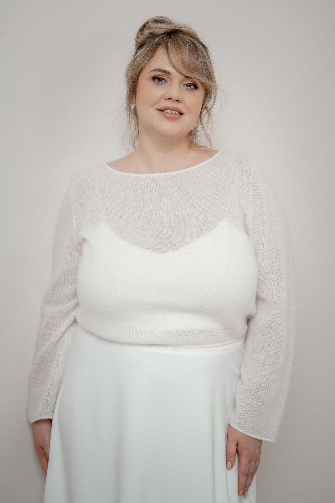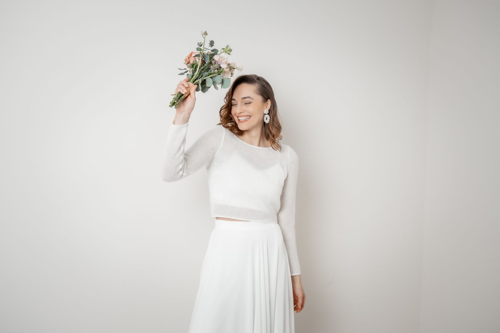 Ein Braut Pullover kann auf verschiedene Arten kombiniert werden, je nachdem, welchen Look du erzielen möchtest. Trage ihn über einem ärmellosen Top während der kirchlichen Trauung und zu einem High Waist Braut Rock oder einer Hose für einen modernen und trendigen Look. Ein Pullover ist wie gemacht für unsere Mix & Match Brautmode und ideal als Topper über einem Crop Top.