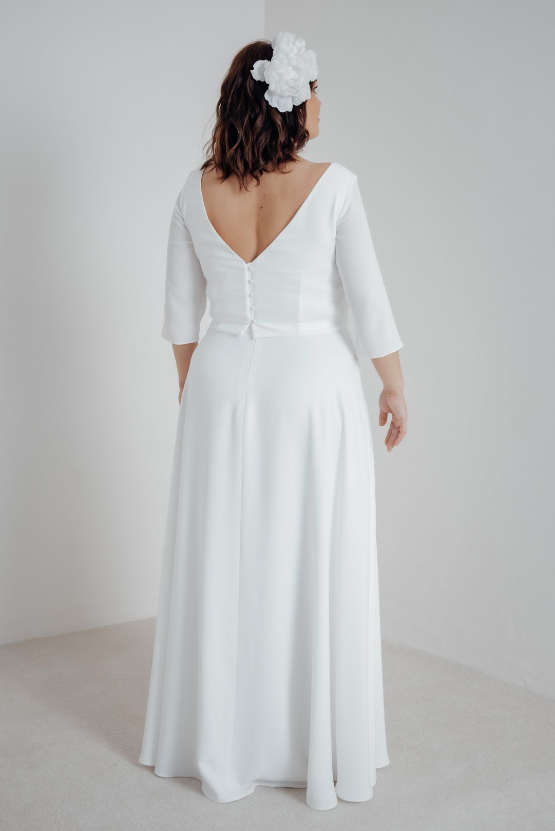 Unsere Röcke, Kleider, Hosen und Jumpsuits werden bewusst etwas länger angefertigt, sodass sie auch von höher gewachsenen Bräuten getragen werden können.