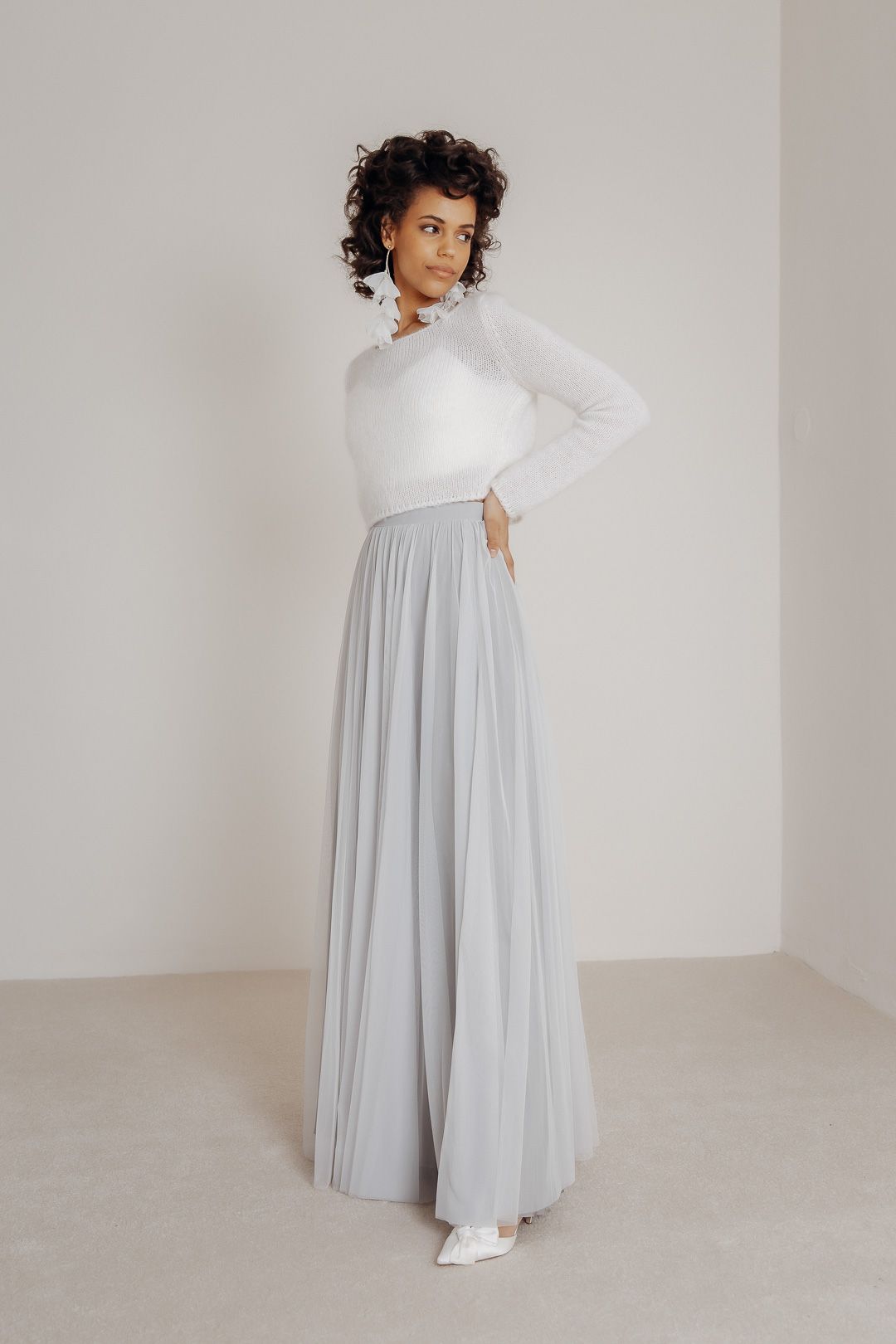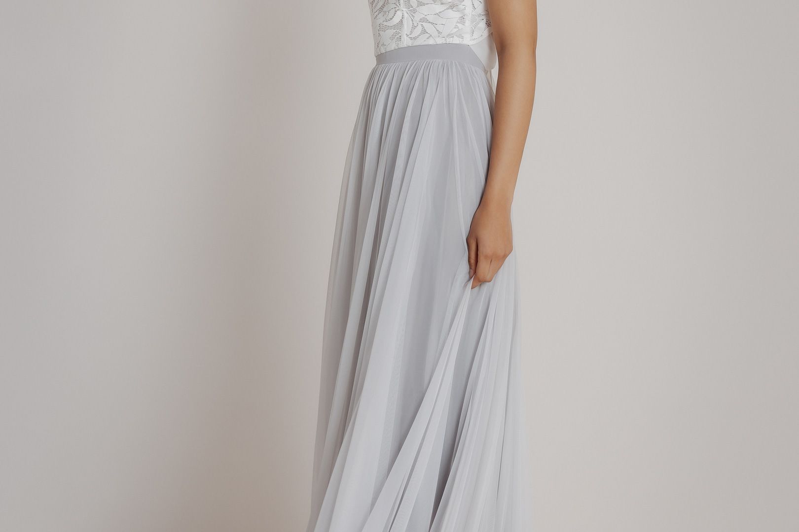 Luftig leicht kommt unser schlichter Rock aus fließendem Tüll daher. Mit schmalem Bund in Grau ist der Tüllrock ein origineller Farbakzent für eine moderne Hochzeit, schließlich muss es nicht immer Weiß oder Ivory sein.