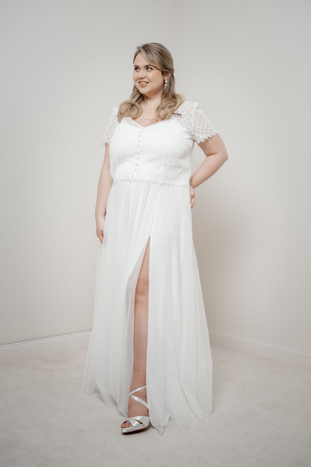 Zweiteilige Brautkleider sind die perfekte Wahl für moderne Bräute, die einen individuellen Stil suchen. Mit sogenannter Mix & Match Brautmode wählst du genau das Oberteil und den Braut Rock, die zu dir und deinen Vostellungen passen. Du hast bei einem noni Brautkleid nicht nur jede Freiheit einen ganz eigenen Look für die Hochzeit zu kreieren, sondern kannst so auch unterschiedliche Größen für Top und Rock wählen, sodass dein Hochzeitsoutfit perfekt zu dir und deiner Figur passt.