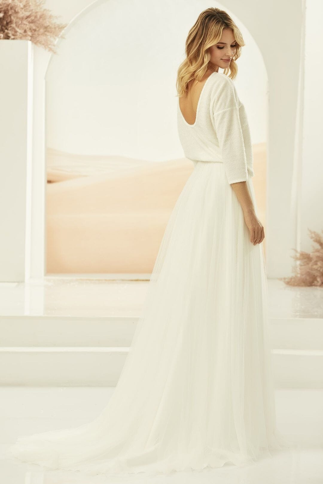 Schlichter Braut Sweater mit Bateau-Ausschnitt vorne und abgerundetem Rückenausschnitt. Bewusst puristisch gehalten, ist der Pullover eine lässig-elegante Alternative zu verspielten Oberteilen.