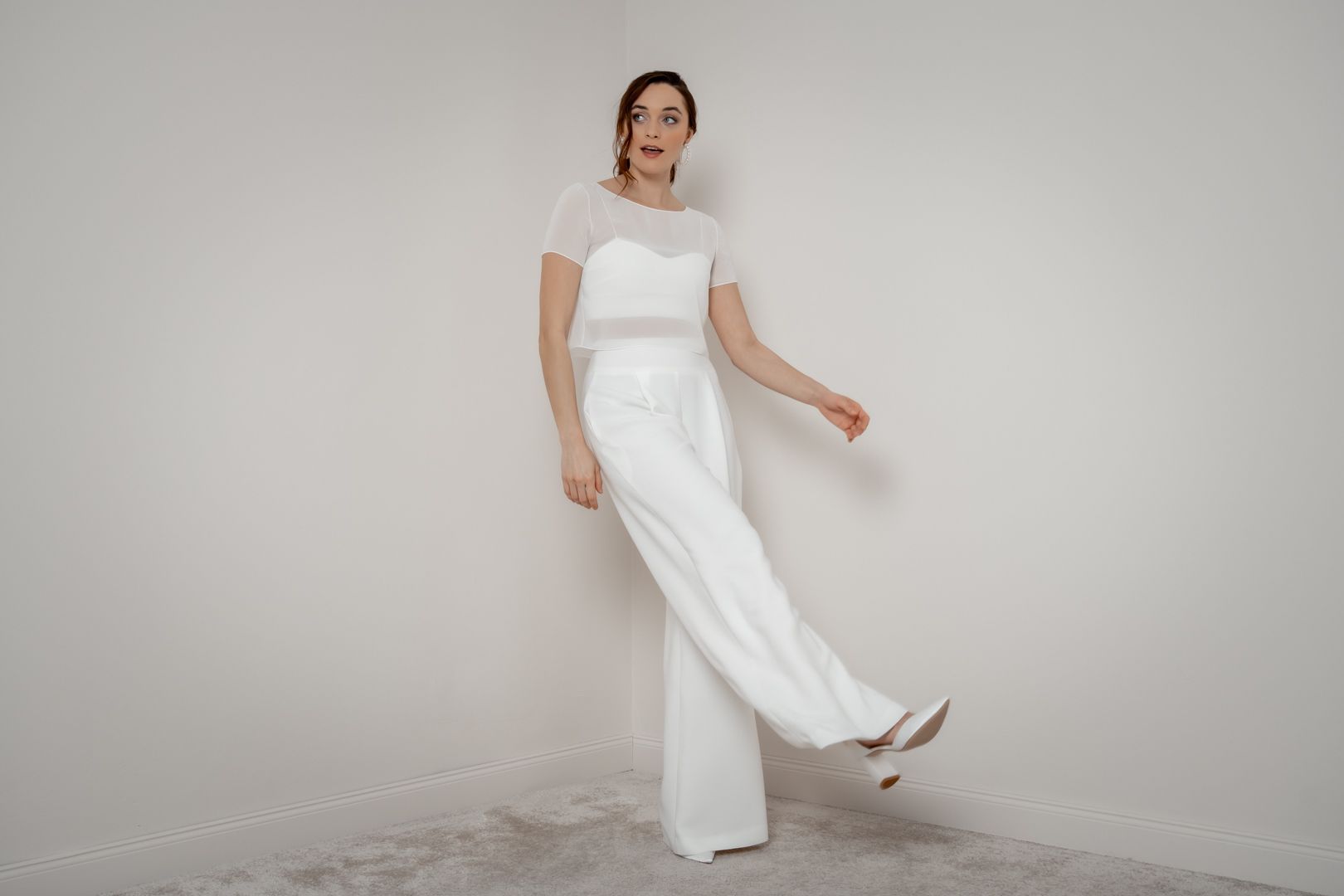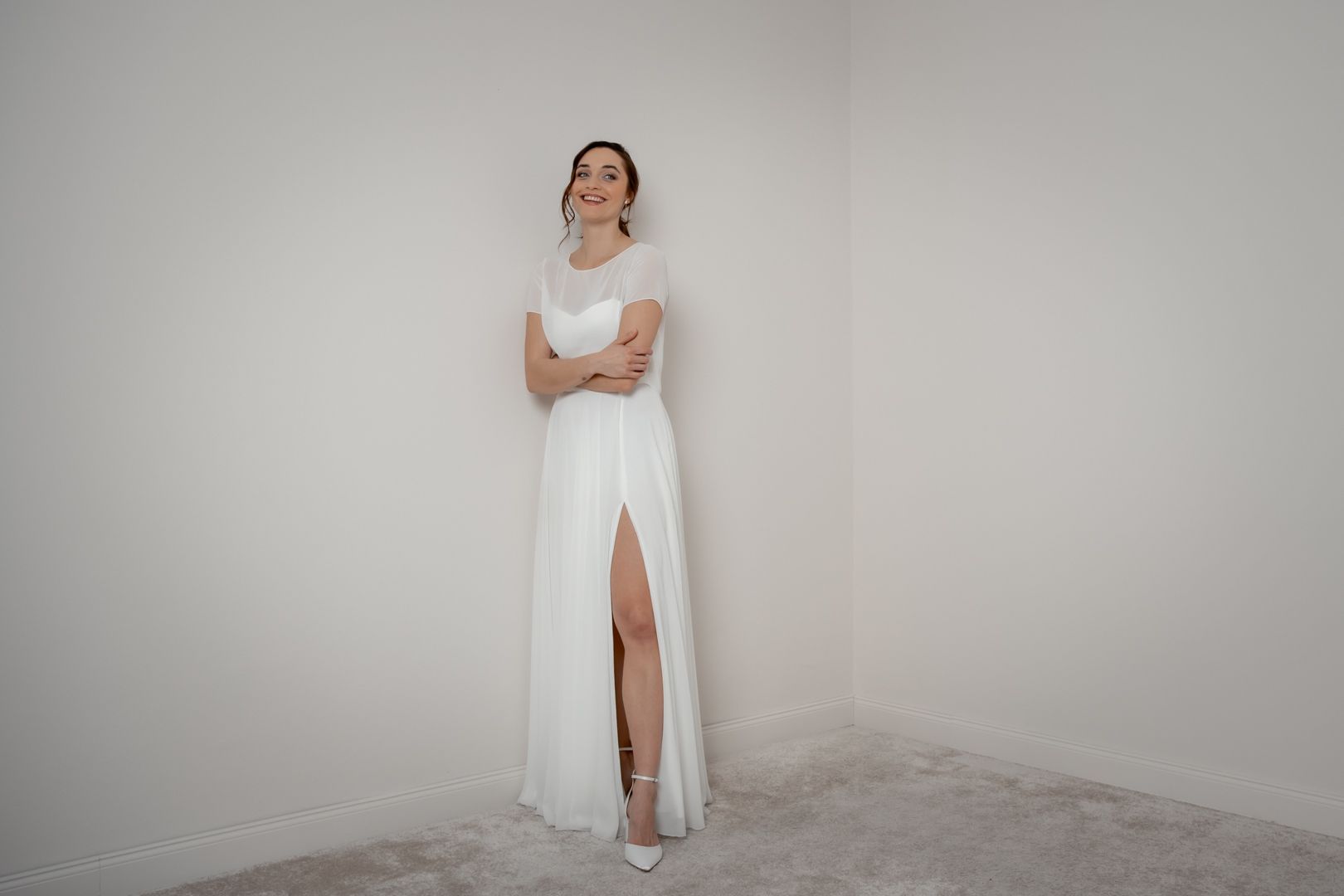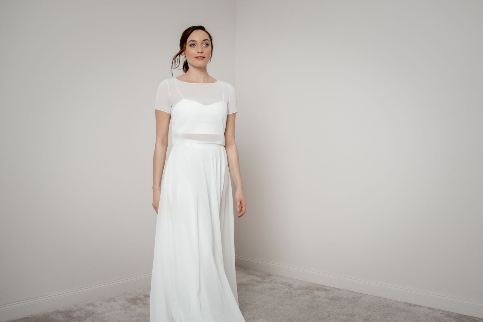 Unsere Röcke, Kleider, Hosen und Jumpsuits werden bewusst etwas länger angefertigt, sodass sie auch von höher gewachsenen Bräuten getragen werden können.