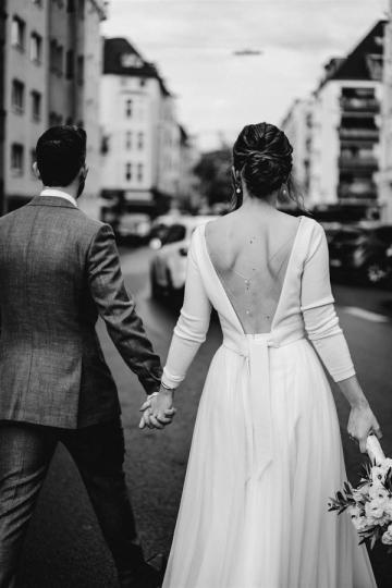 Sinnlichkeit und Eleganz: Das Zeigen des Rückens in einem rückenfreien Brautkleid kann eine subtile Sinnlichkeit und Eleganz vermitteln. Der reizvolle Ausschnitt kann romantisch und gleichzeitig geschmackvoll wirken. Der Rückenbereich ist oft ein ästhetisch ansprechender Bereich, und rückenfreie Brautkleider können auf Fotos besonders schön wirken. So haben Hochzeitsfotografen die Möglichkeit, den Rücken und die Details des Kleides in Szene zu setzen.