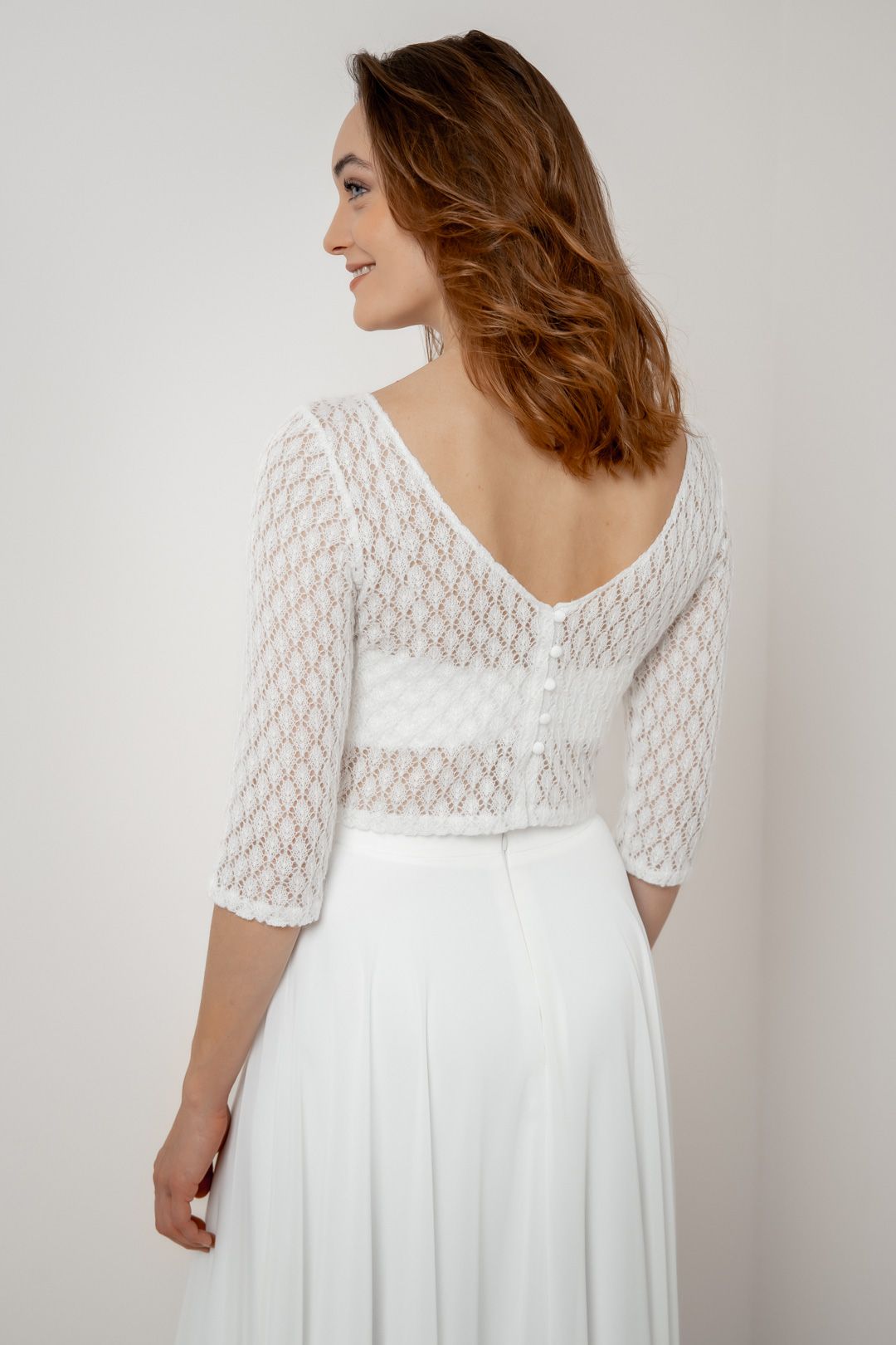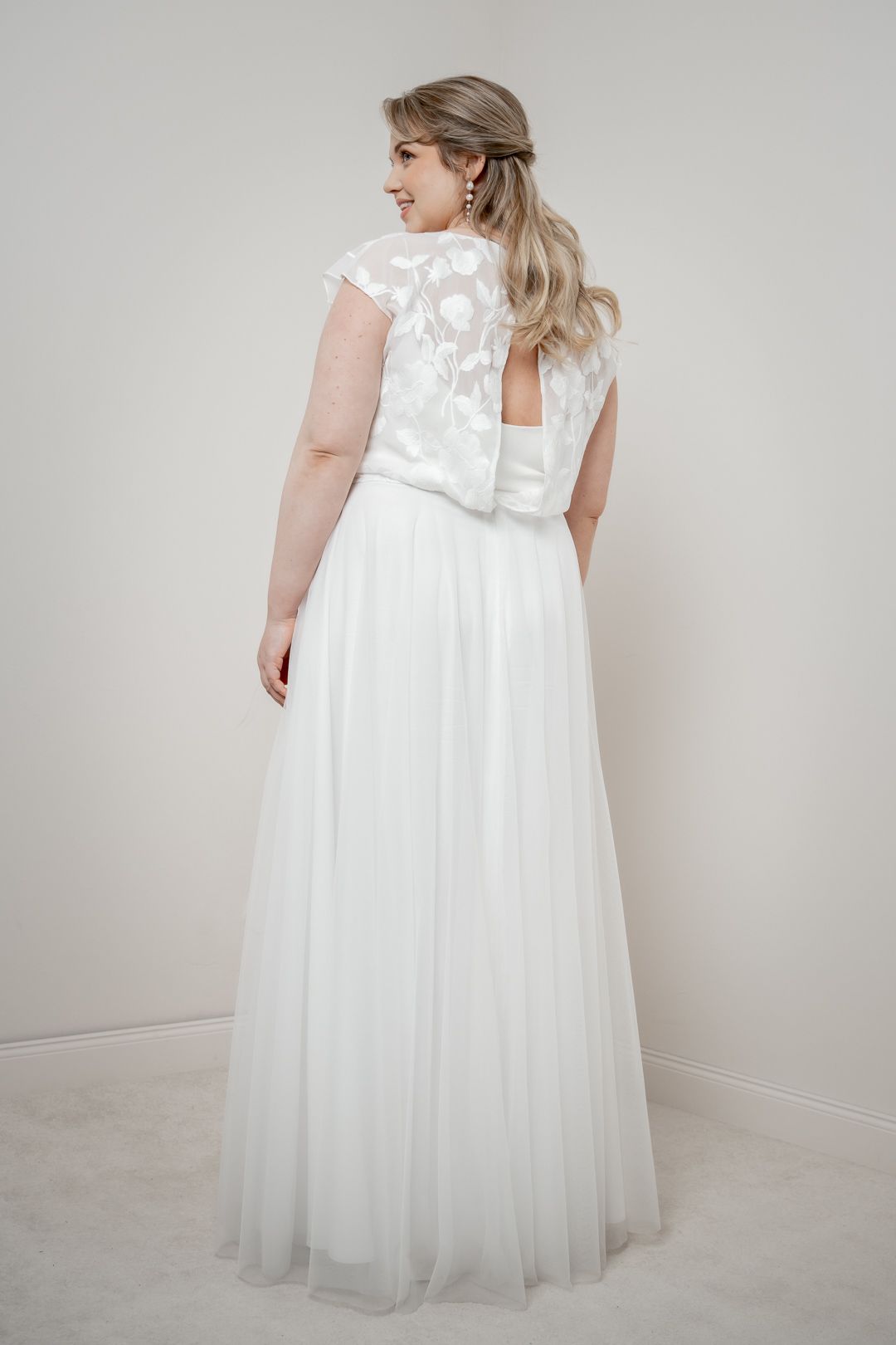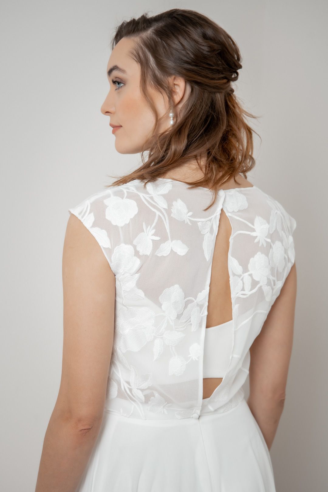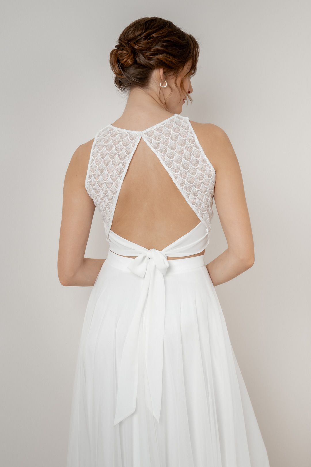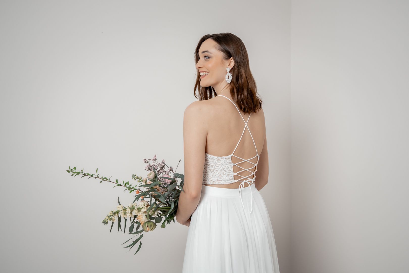Schnürung oder Knöpfe: Rückenfreie Kleider können mit einer Schnürung oder einer Reihe von Knöpfen am Rücken versehen sein. Dieses Detail fügt nicht nur visuelles Interesse hinzu, sondern ermöglicht auch eine individuelle Anpassung an die Figur der Braut.