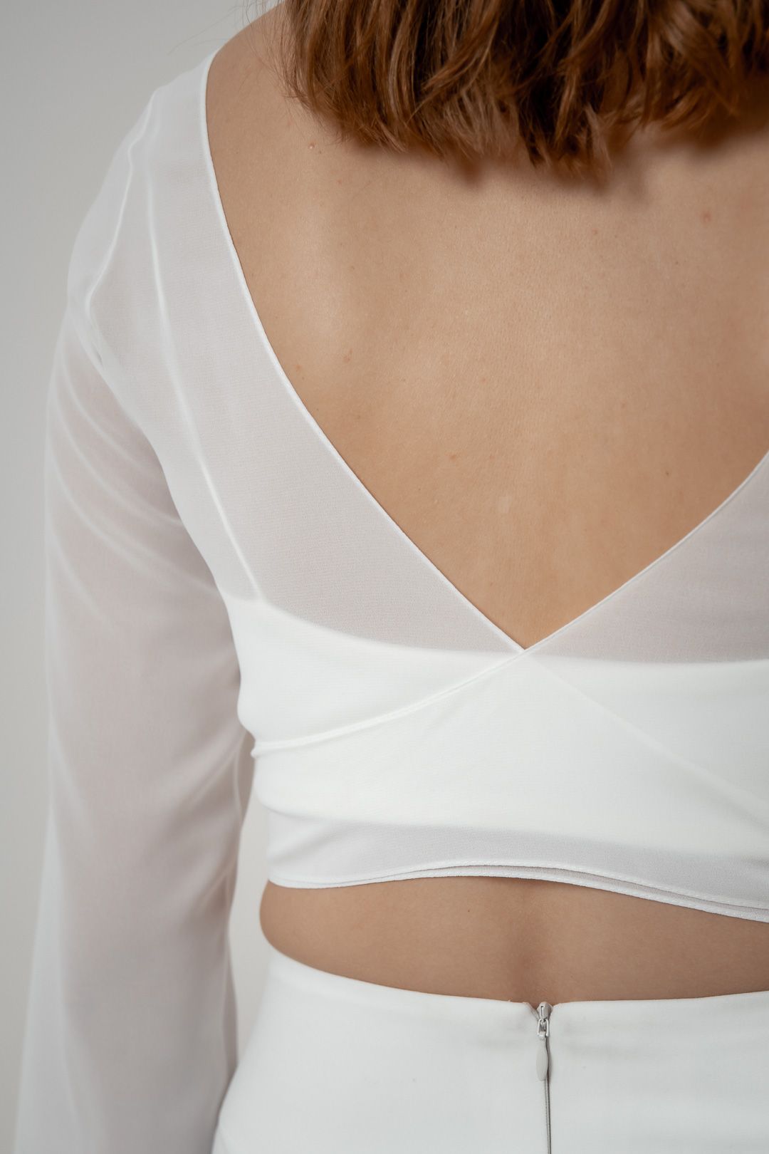 Illusionsrücken: Bei Brautkleidern mit Illusionsrücken werden durchsichtige Stoffe wie Spitze oder Tüll verwendet, um einen rückenfreien Look zu erzeugen, während gleichzeitig subtile Details hinzugefügt werden. Dieser Stil verleiht dem Kleid eine verspielte Note.