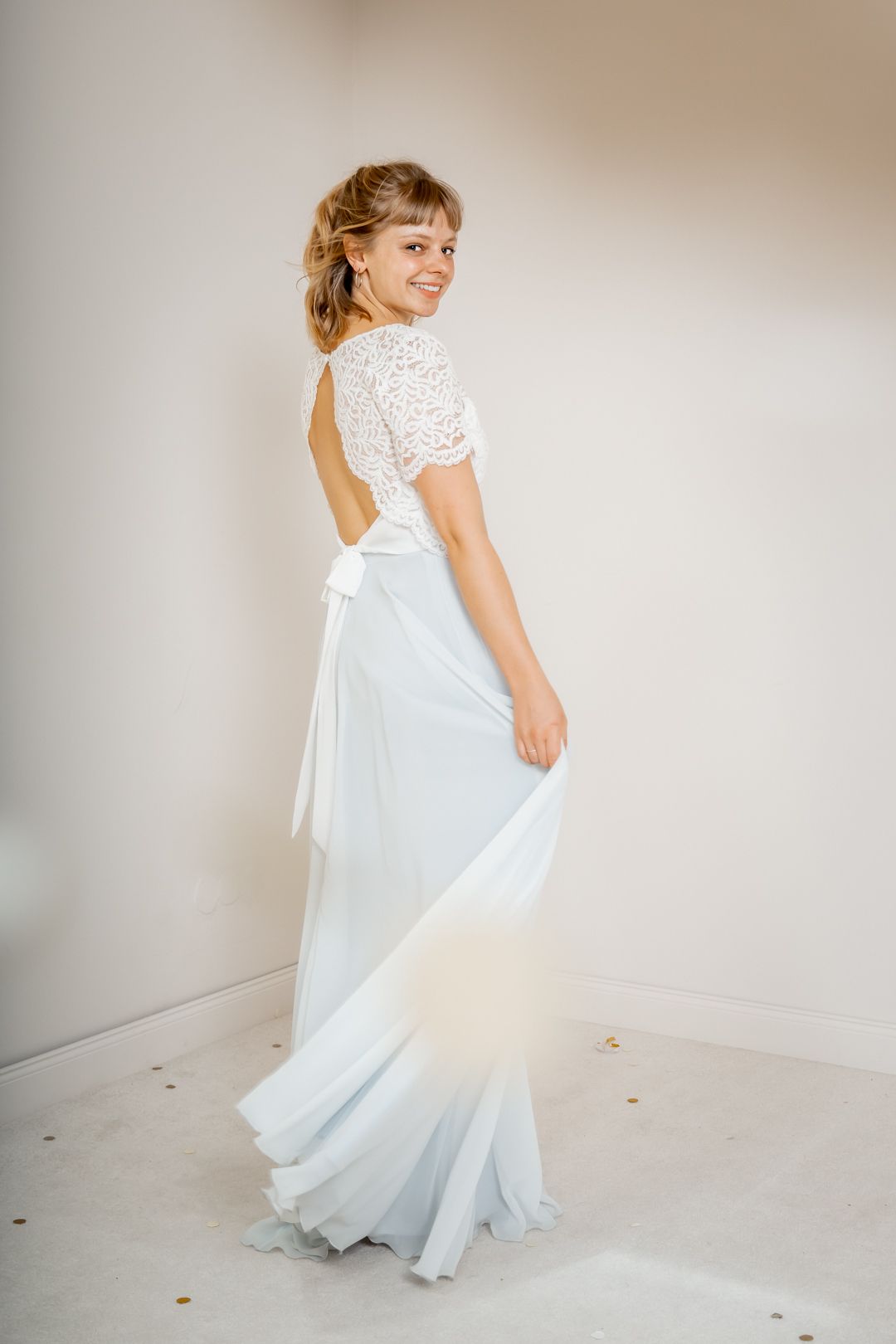 - Blau: Hellblaue Brautkleider sind eine moderne Wahl, die einen Hauch von Frische und Eleganz mit sich bringt. Blau kann auch eine symbolische Bedeutung haben, da es für Treue und Loyalität steht. Dunkelblaue Brautkleider wirken edel und bieten die Möglichkeit, die Persönlichkeit der Braut zu betonen und einen individuellen Stil zu zeigen, der sich von traditionellen Farben abhebt.
