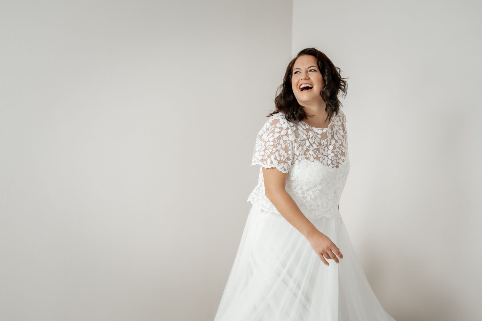 Unsere Röcke, Kleider, Hosen und Jumpsuits werden bewusst etwas länger angefertigt, sodass sie auch von höher gewachsenen Bräuten getragen werden können.