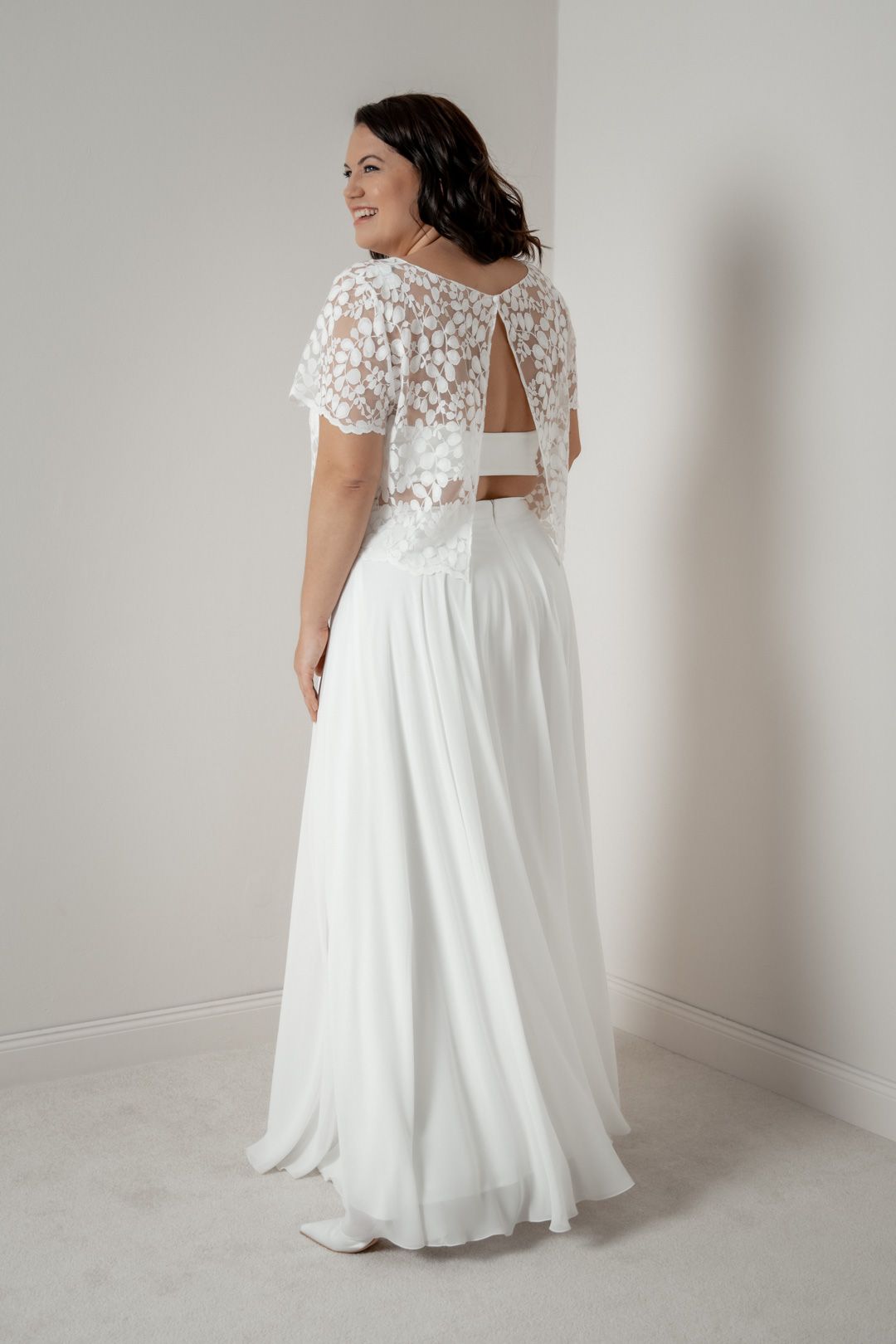 Zu kombinieren ist Aza mit jeder Art von schlichtem Braut Rock oder Hose, genauso wie als Topper über schlichten einteiligen Brautkleidern.