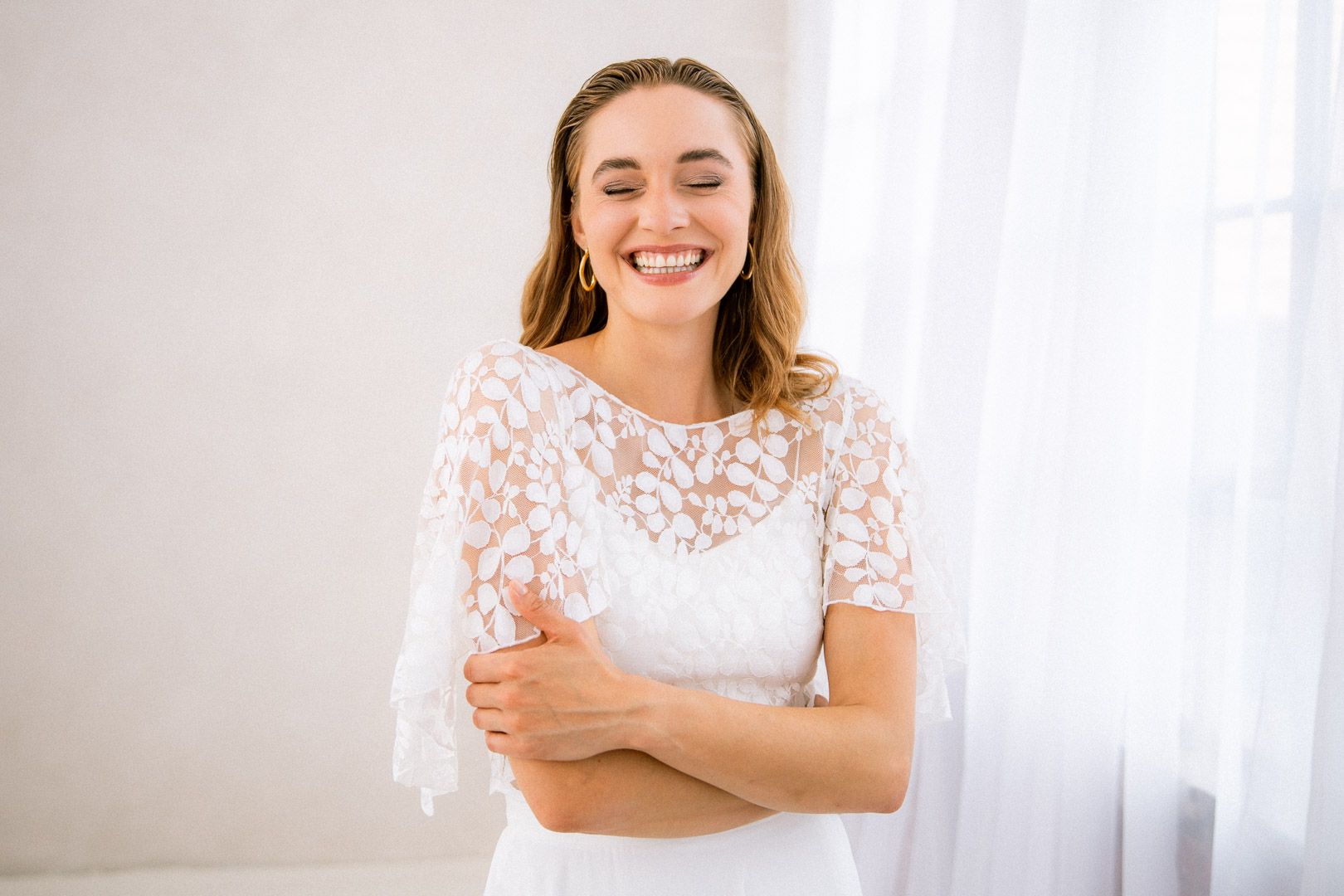 Unsere Röcke, Kleider, Hosen und Jumpsuits werden bewusst etwas länger angefertigt, sodass sie auch von höher gewachsenen Bräuten getragen werden können.