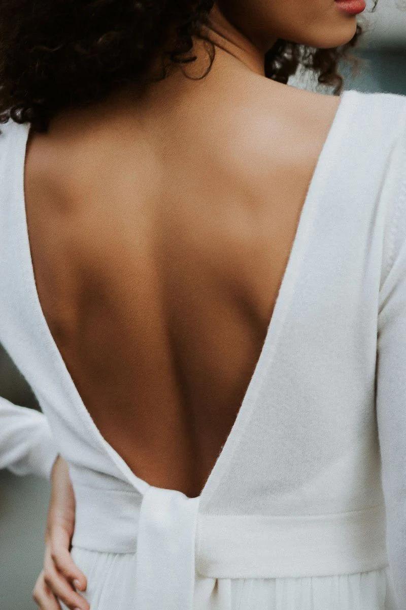 Je nach Schnitt und Passform kommt auch ein Braut Pullover in Frage, so beispielsweise unser Dawn-Pulli mit großzügigem Rückenausschnitt und lockerem Bindeband.
