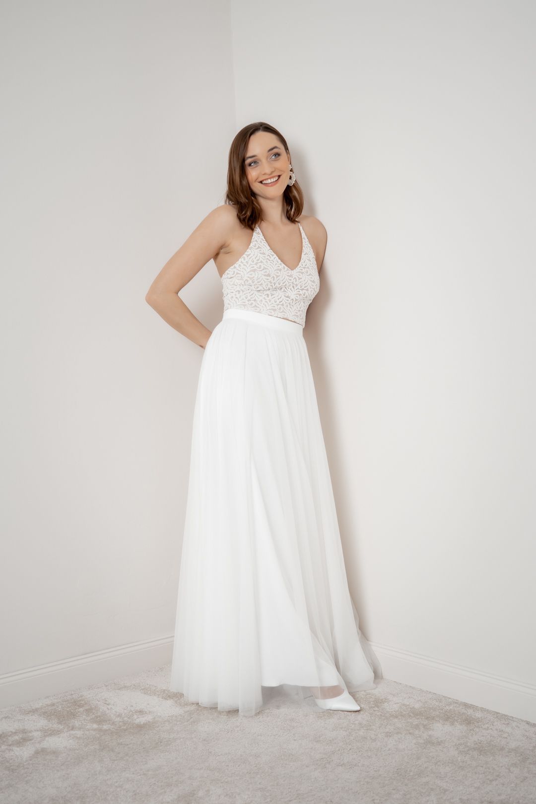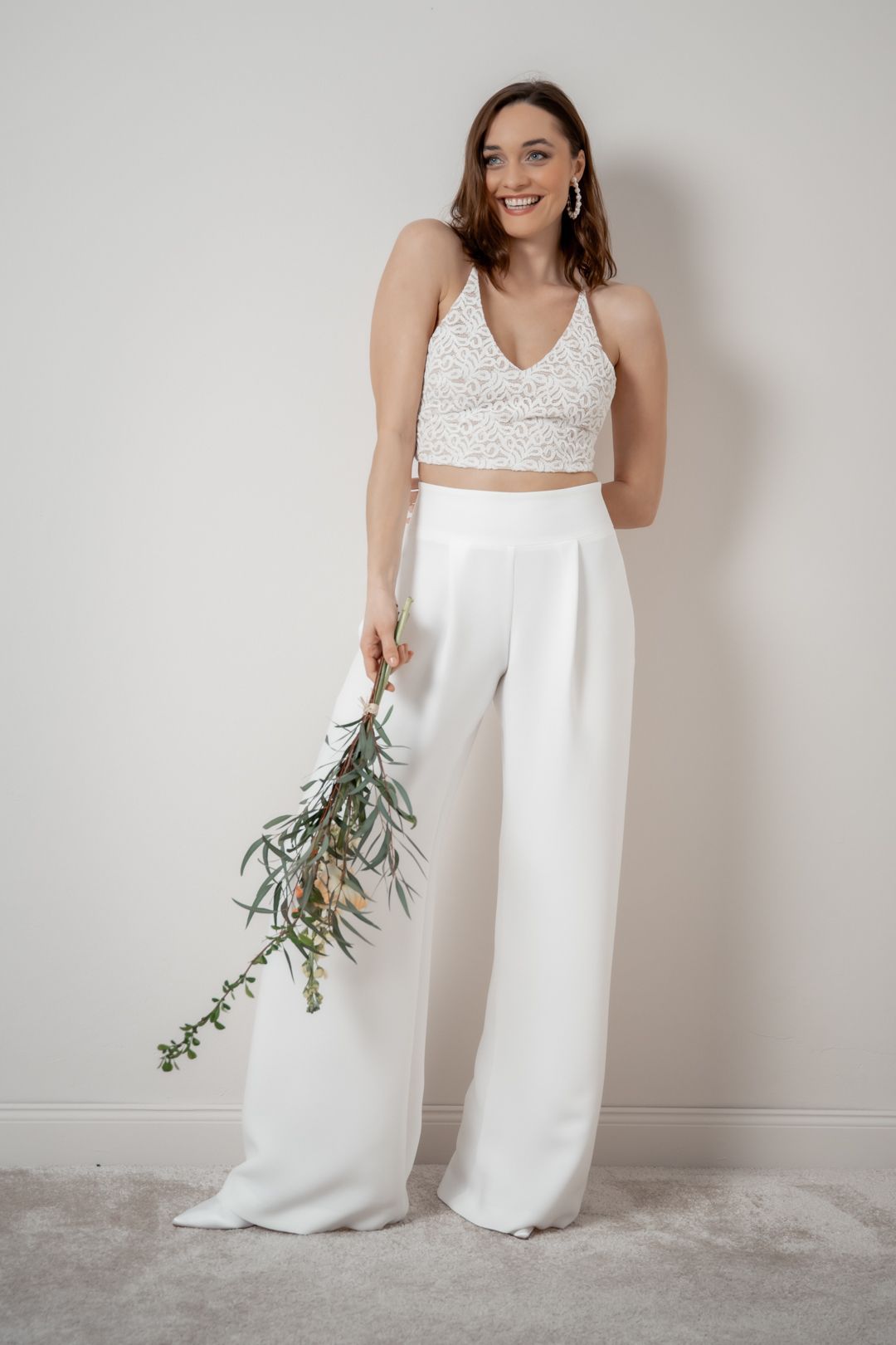 Unsere Röcke, Kleider, Hosen und Jumpsuits werden bewusst etwas länger angefertigt, sodass sie auch von höher gewachsenen Bräuten getragen werden können.