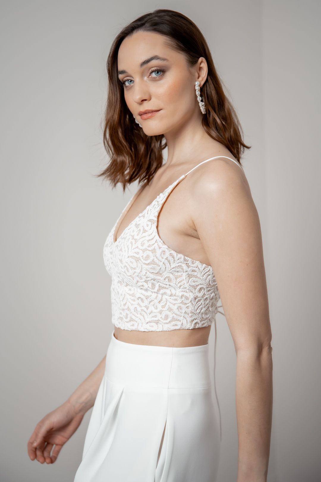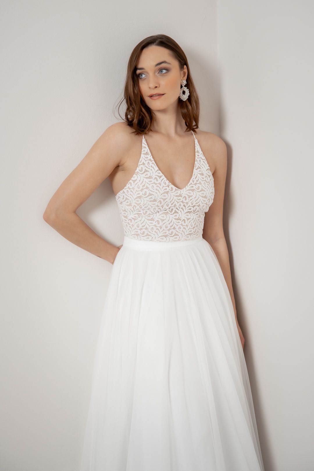 Freie Schultern, ein ornamentales Spitzenmuster im Vintage-Style, ein verführerischer V-Ausschnitt und ein nahezu freier Rücken mit sinnlicher Schnürung – fertig ist unser Filiz Braut Top! Ideal als Oberteil für moderne und selbstbewusste Bräute, die ihre Vorzüge gerne in Szene setzen.