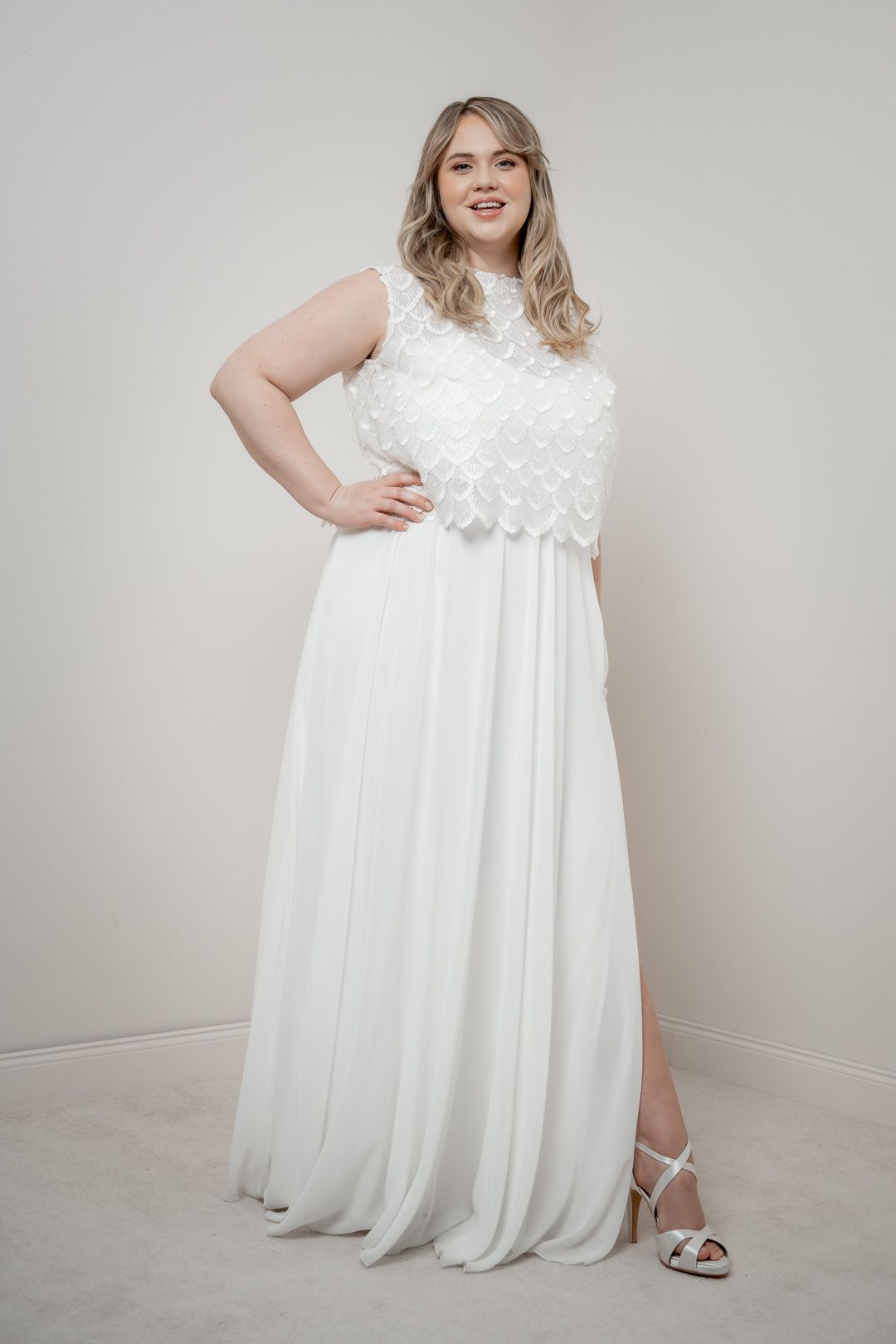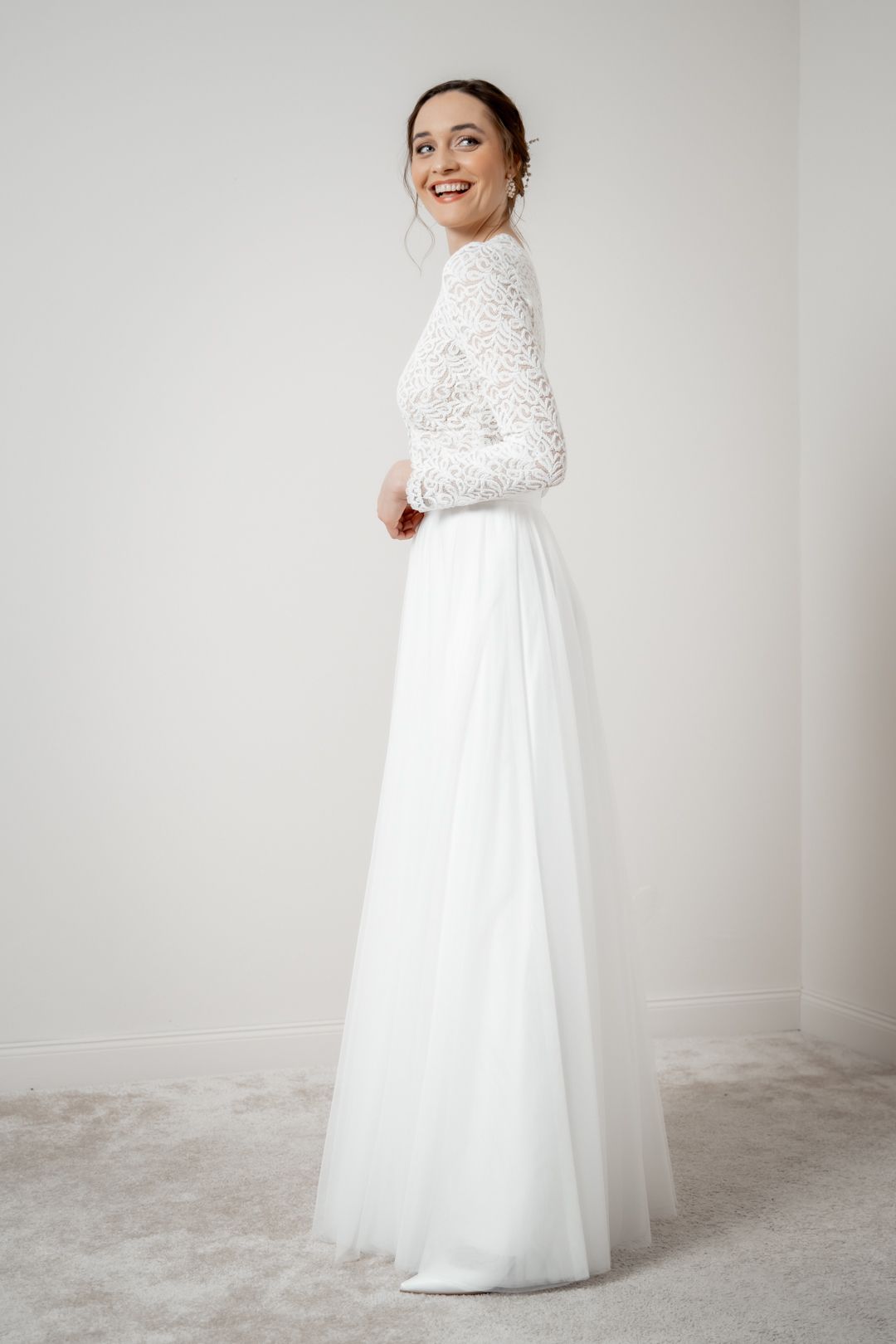 - Bodenlang: Hier passen schlichte, aber edle Accessoires sowie ein eleganter Schleier, um den Look nicht zu überladen.