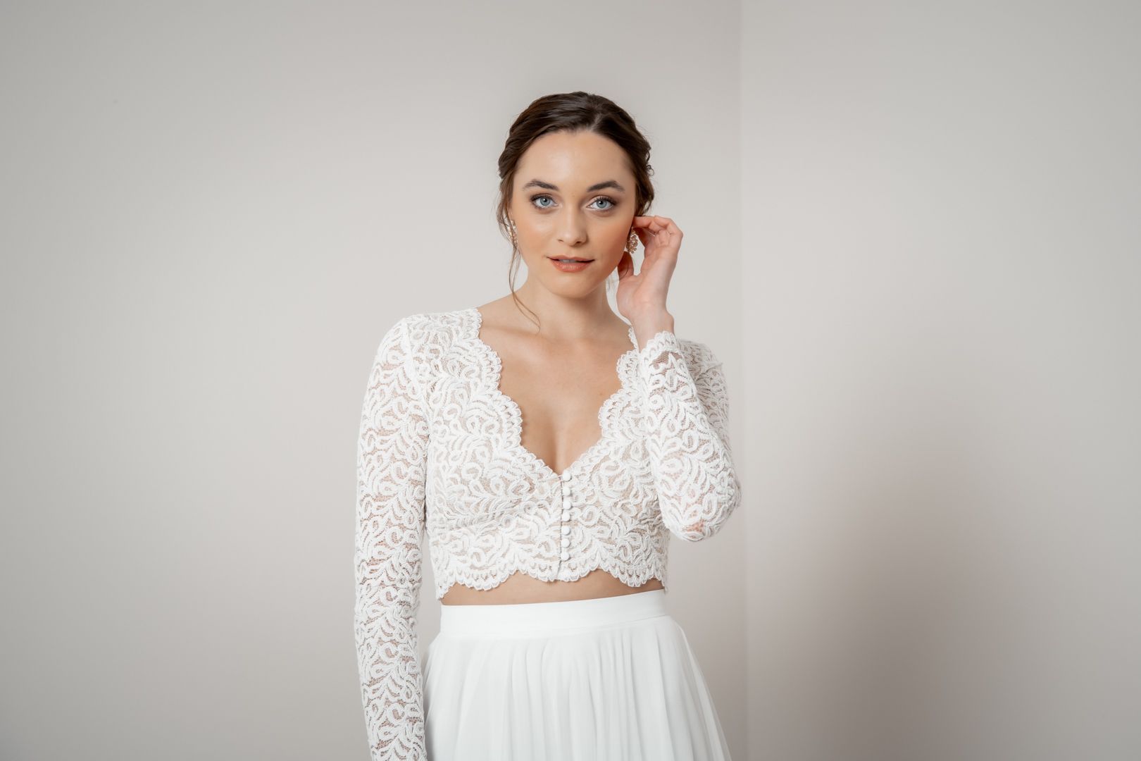 Achte darauf, dass der Schmuck den Gesamtlook ergänzt, ohne ihn zu überladen. Vermeide zu auffällige, große Stücke, die von deinem Kleid ablenken könnten. Besonders bei detaillierten Kleidern mit Spitze oder Verzierungen ist weniger oft mehr – dezenter Schmuck bewahrt den klassischen, eleganten Braut Look und lässt dich strahlen.