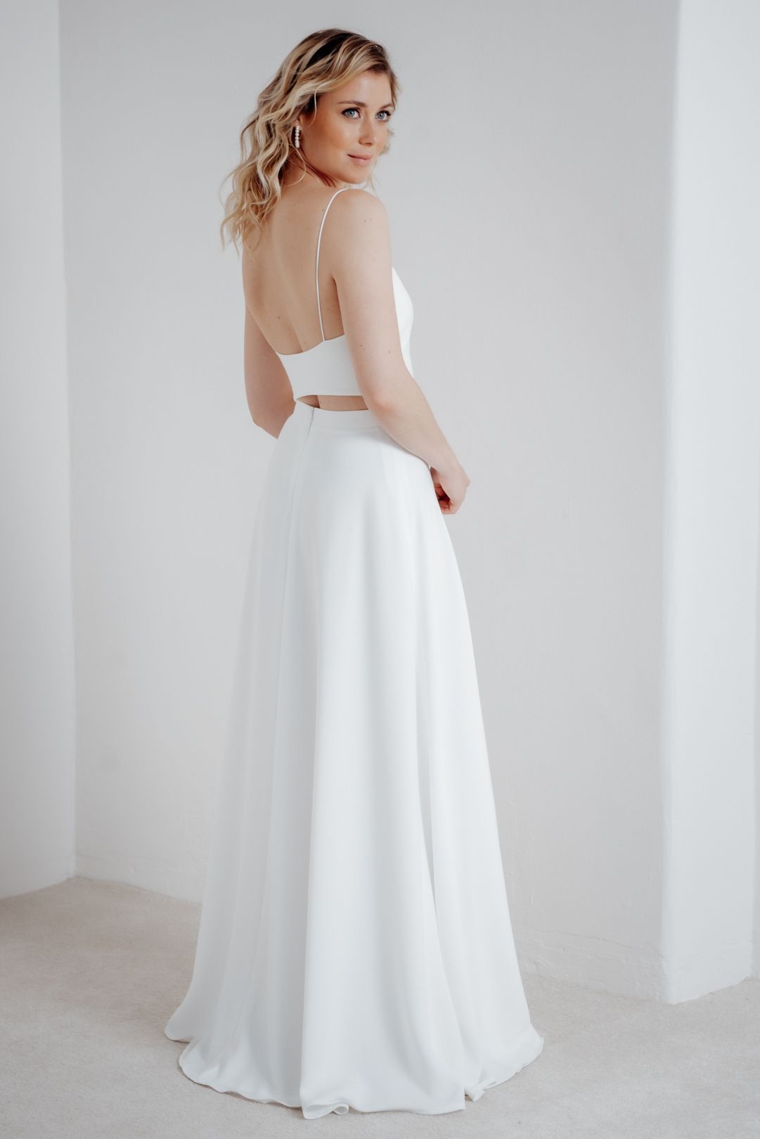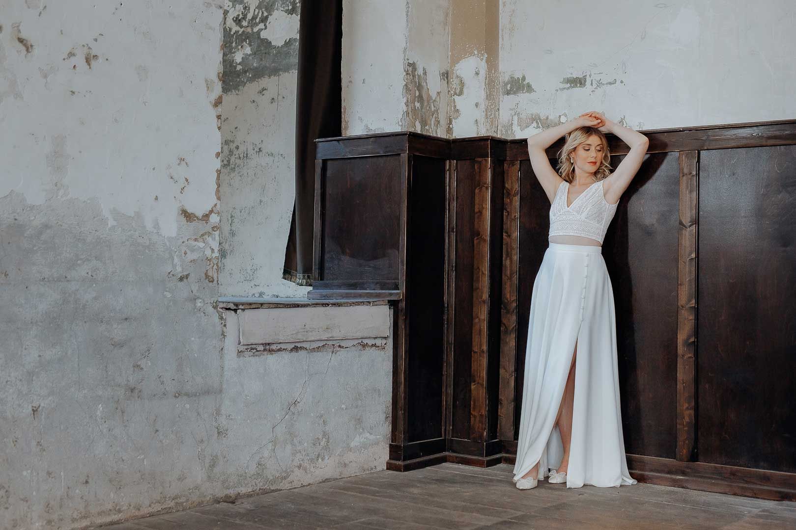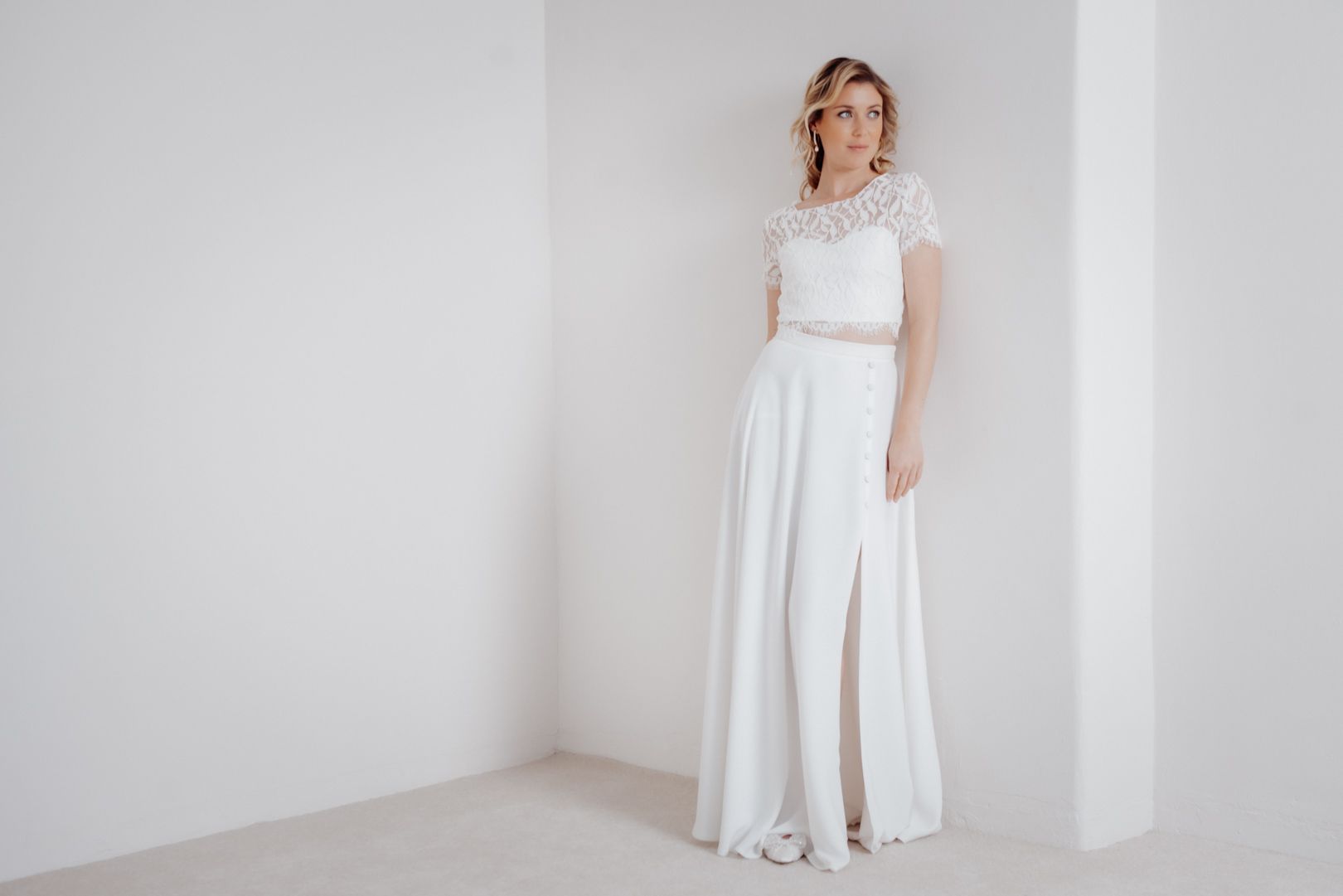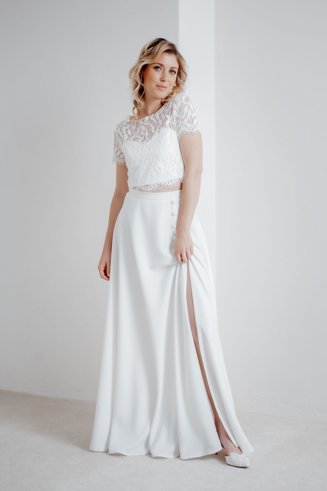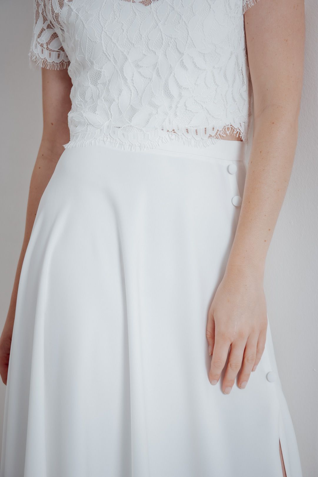 For skirts and trousers, the length and width can be easily adjusted by a good tailor. Our bottoms are deliberately cut a little longer so they can also be worn by taller brides – so if your skirt appears too long at first glance, that's perfectly normal and shouldn't bother you.