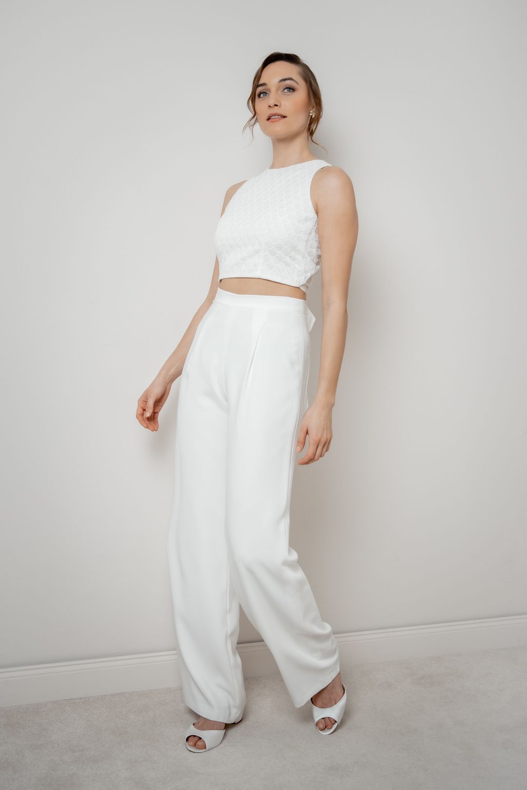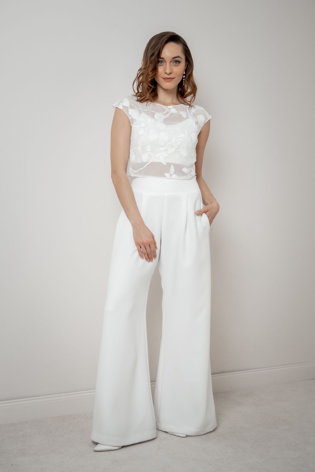 - Accessories: Think about the accessories you want to wear with the pants suit. This can include shoes, jewellery, a veil, a flower in your hair, or other details. Make sure the accessories match the overall look.