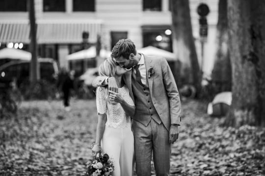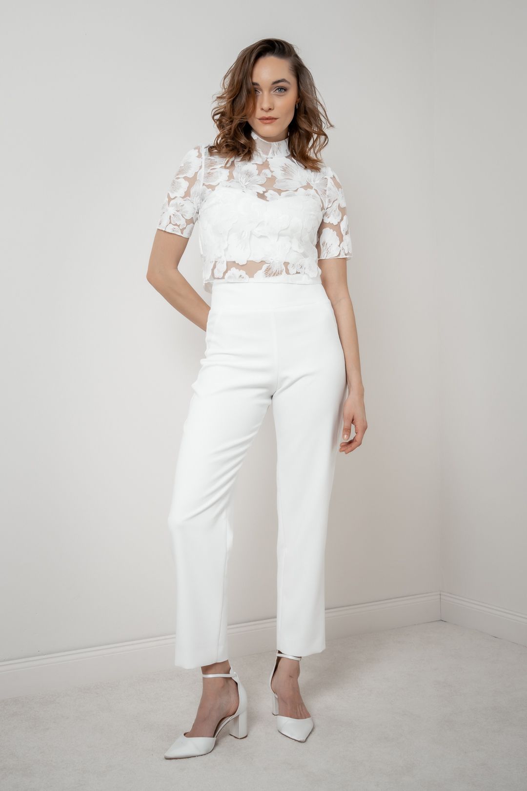 Perfect for the registry office are trousers that you can combine with a top and - depending on your taste - with a blazer to create a stylish trouser suit. Whether with a patterned lace top, a modern bridal sweater or a crepe top, with a back neckline, off-shoulder or sweeping flounced sleeves, with puristic trousers you can create a feminine and casual look to surprise everyone with an individual outfit .