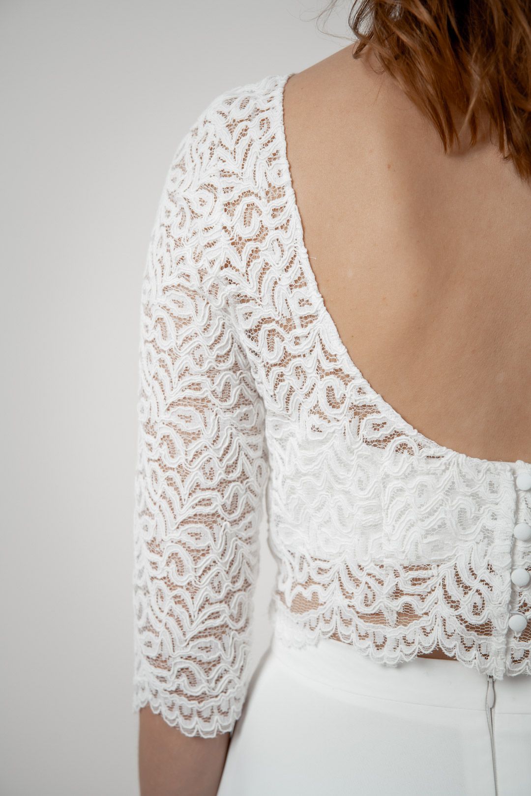 Playful bridal top with pretty scalloped edges at the hems, three-quarter sleeves and a round neckline at the back. The vintage lace pattern creates a particularly elegant look and can be combined well with plain bottoms in ivory (but also in color!).