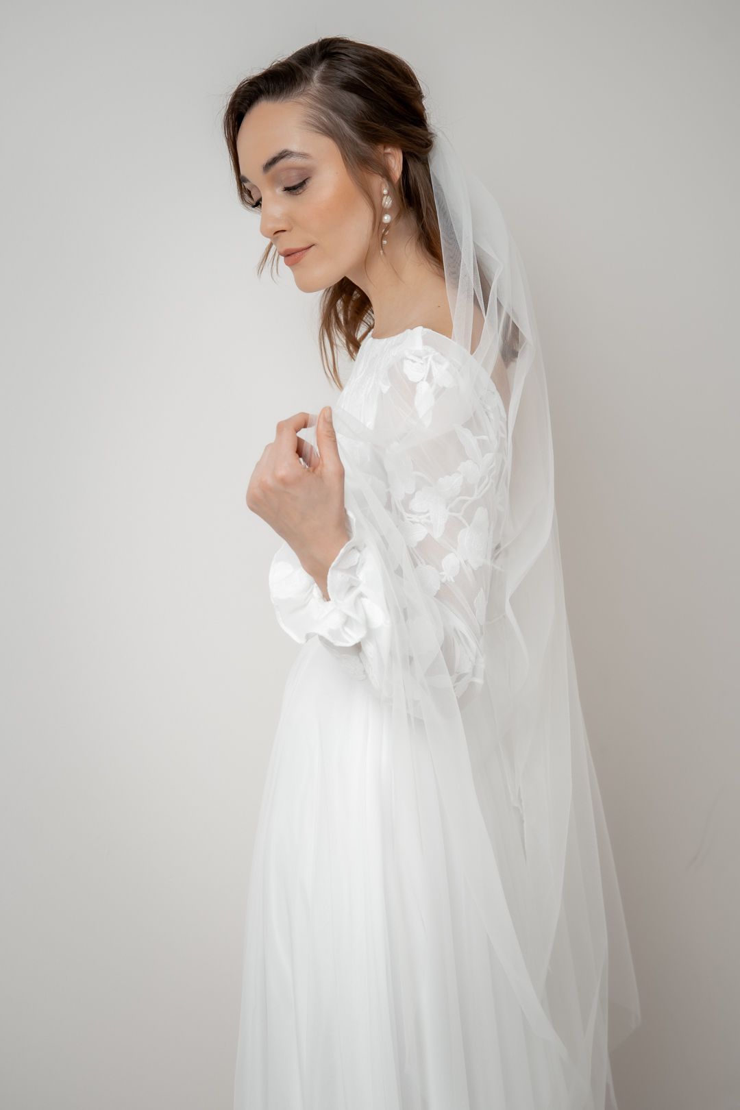 Modern Wedding Dresses: For modern wedding dresses with clean lines and minimalist details, shorter veils such as shoulder length or blusher veils often work well. These veils add a contemporary and simple elegance to the look without distracting from the design of the dress.