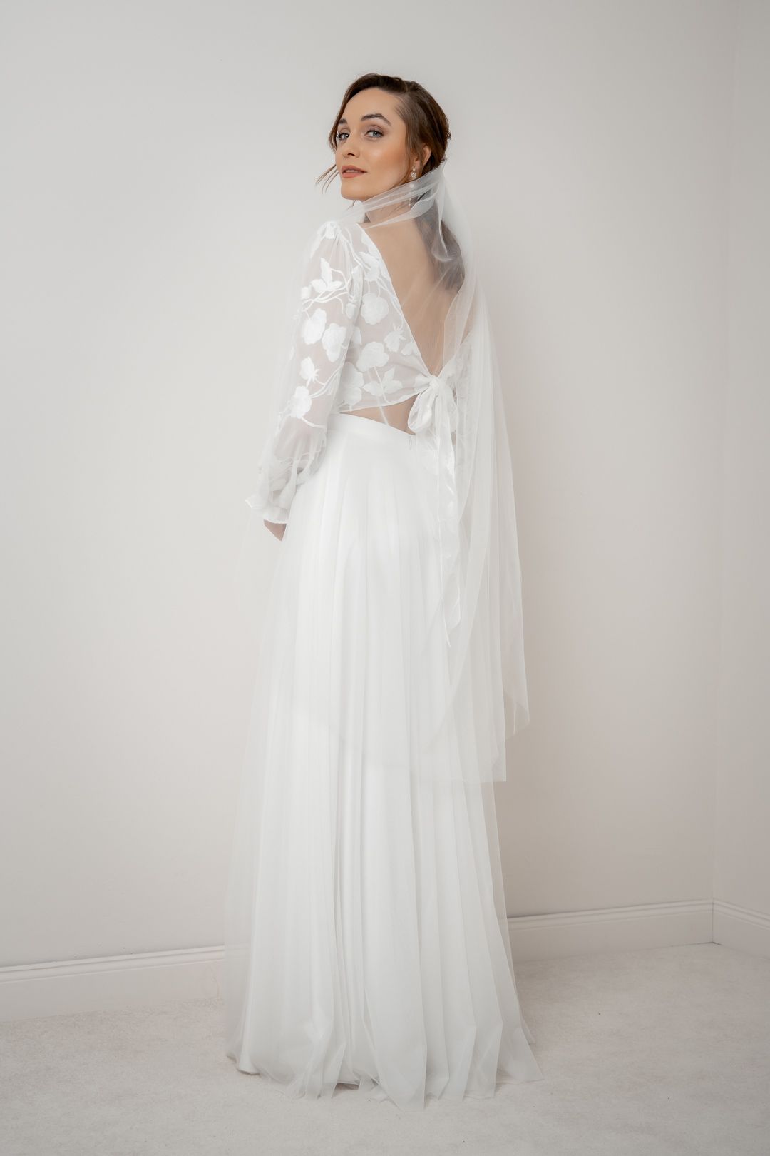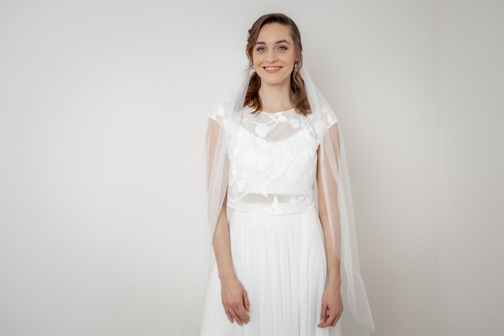 Shoulder Length: This veil style ends at shoulder height and is ideal for wedding dresses with a shorter or off-the-shoulder silhouette. It adds a subtle touch of romance without distracting from the dress.