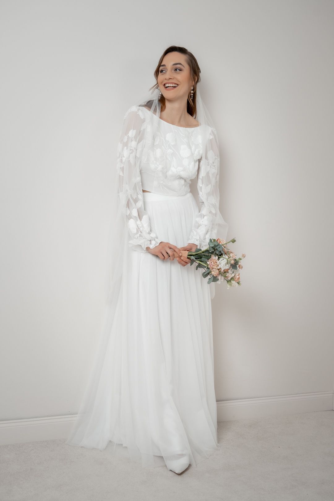 Romantic Wedding Dresses: Wedding dresses with romantic details like lace, floral appliqués, or soft fabrics can pair well with mid-length veils like elbow-length or fingertip lengths. These veils complement the feminine and playful look of the dress.