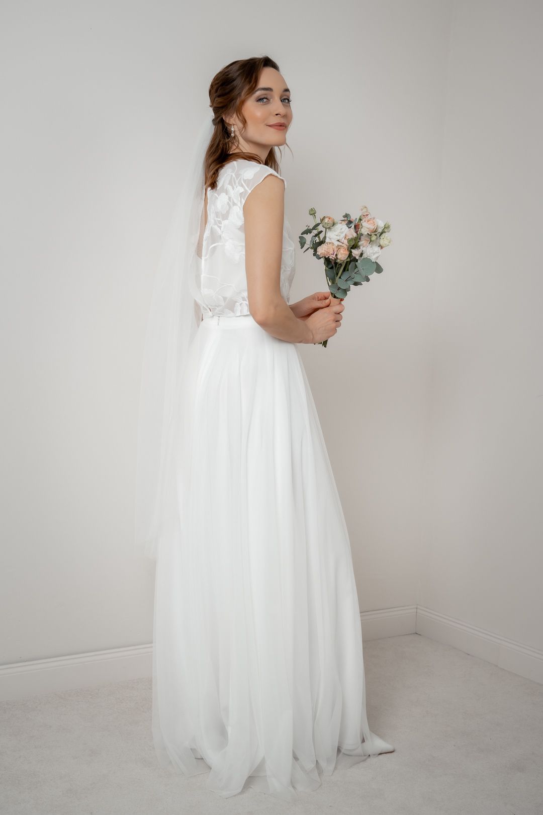 Traditional Wedding Dresses: For classic, traditional wedding dresses, such as ball gowns or A-line dresses, longer veils such as cathedral veils or chapel veils often work well. These veils add a formal and elegant touch to the overall appearance.