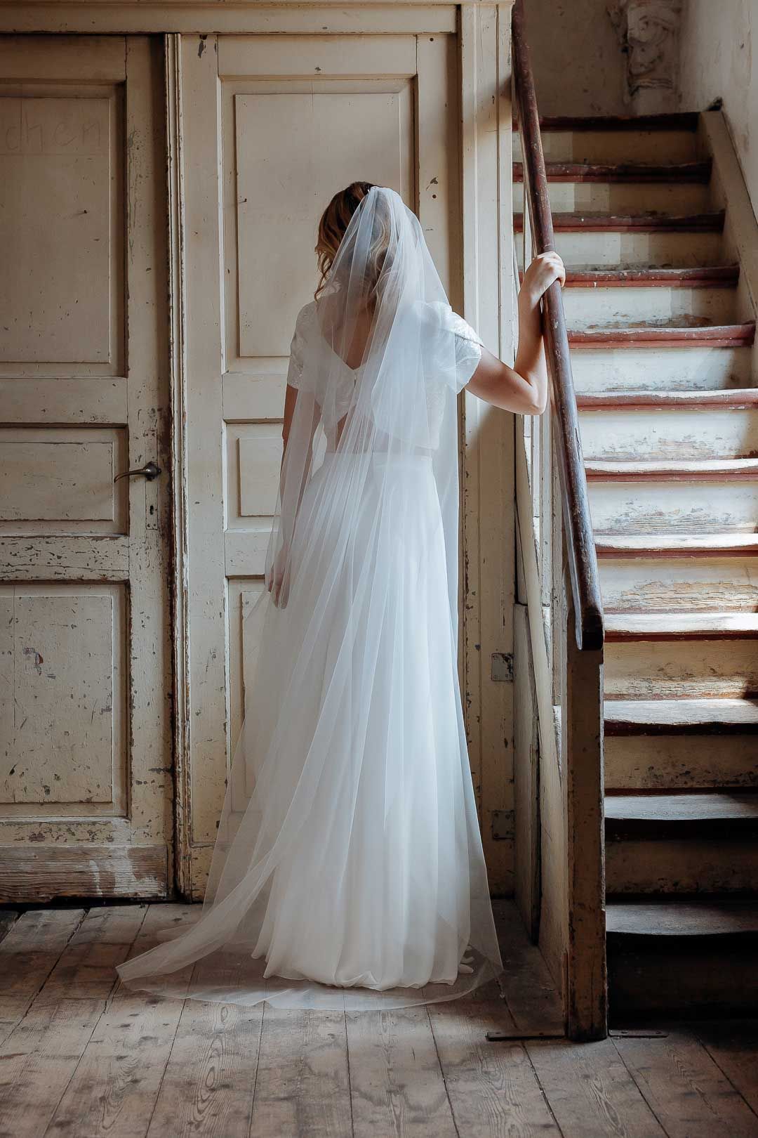 Beach or boho wedding dresses: Airy and loose veils such as veils or loosely falling veils made of tulle or chiffon often work well for beach or boho style wedding dresses. These veils complement the relaxed and casual look of the dress and go well with a beach or outdoor wedding.