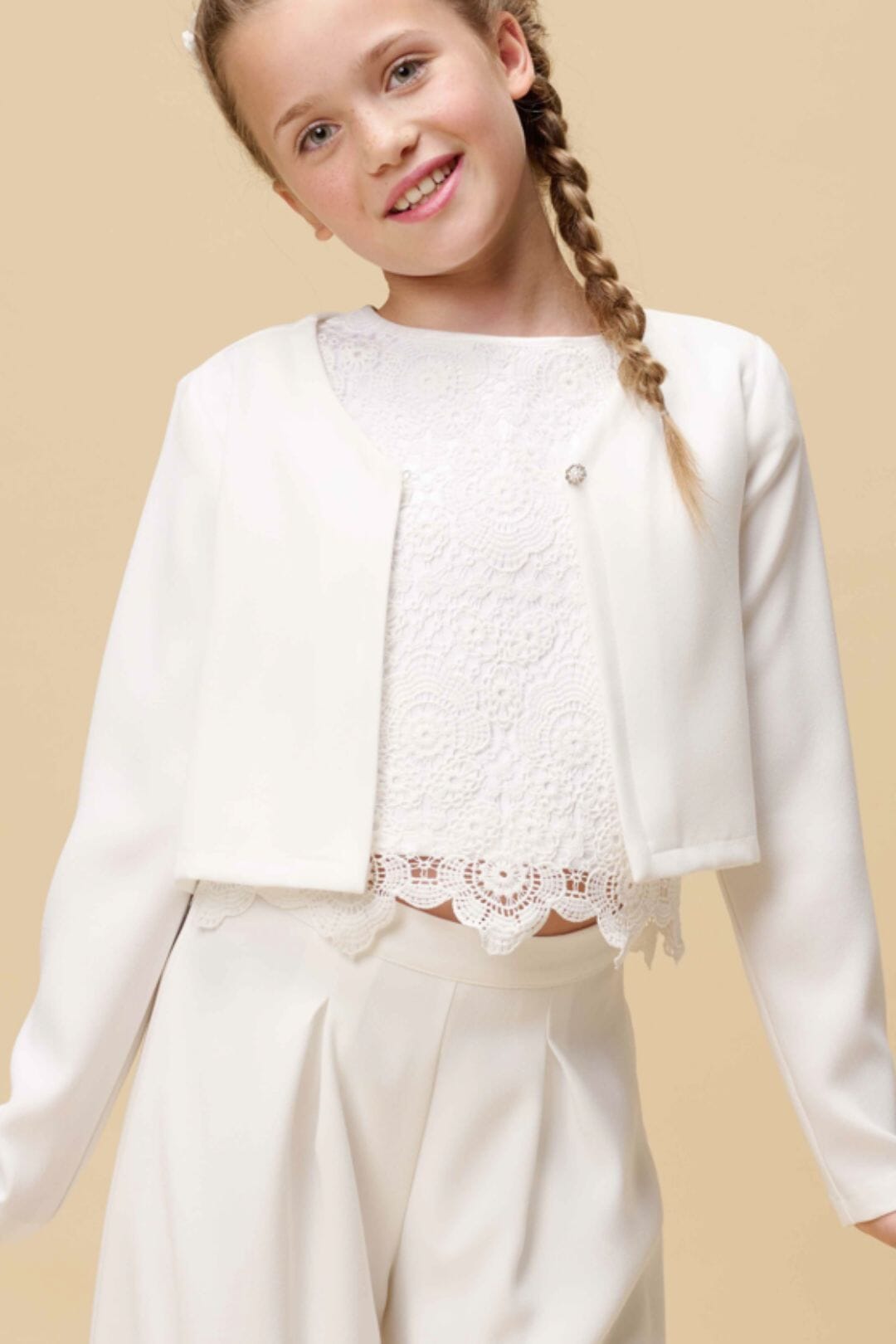 Thanks to its simple and elegant design, the jacket goes well with all communion dresses.