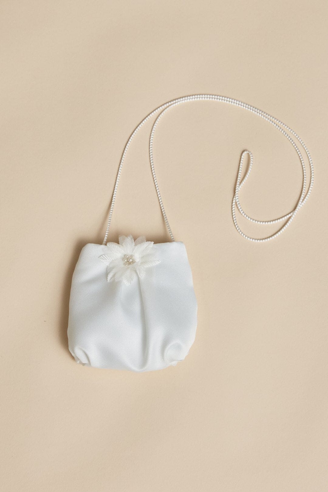 Small handbag with a simple shoulder cord as a charming communion accessory. The central eye-catcher is a delicate fabric flower with faux pearls.