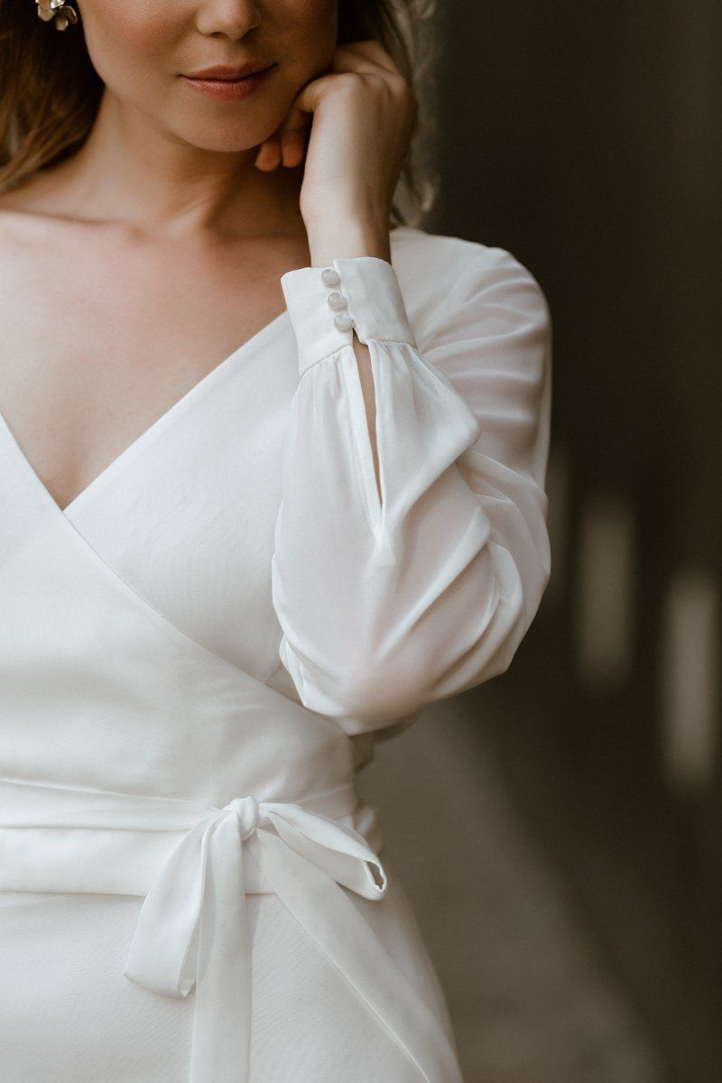 Popular colors such as pastel, navy blue or burgundy add elegant accents, while floral or geometric patterns add a modern touch. The choice of color should harmoniously complement the wedding colors and your personal charisma. The most popular color for wrap dresses for weddings is still white or ivory.