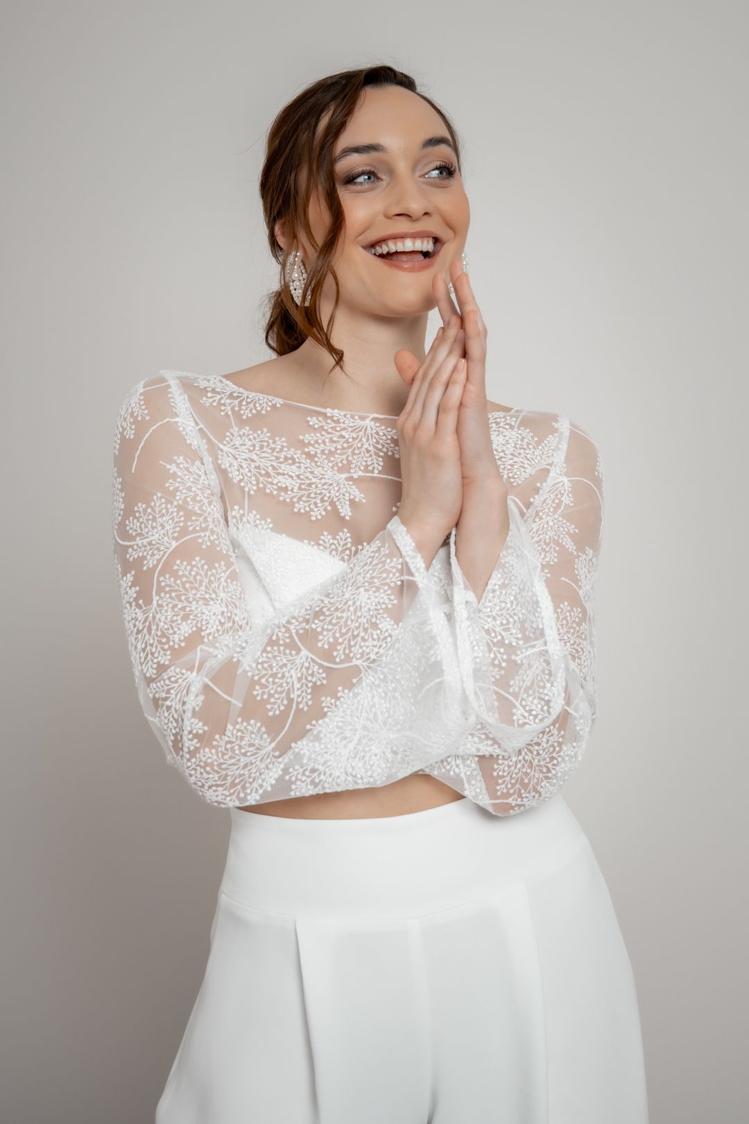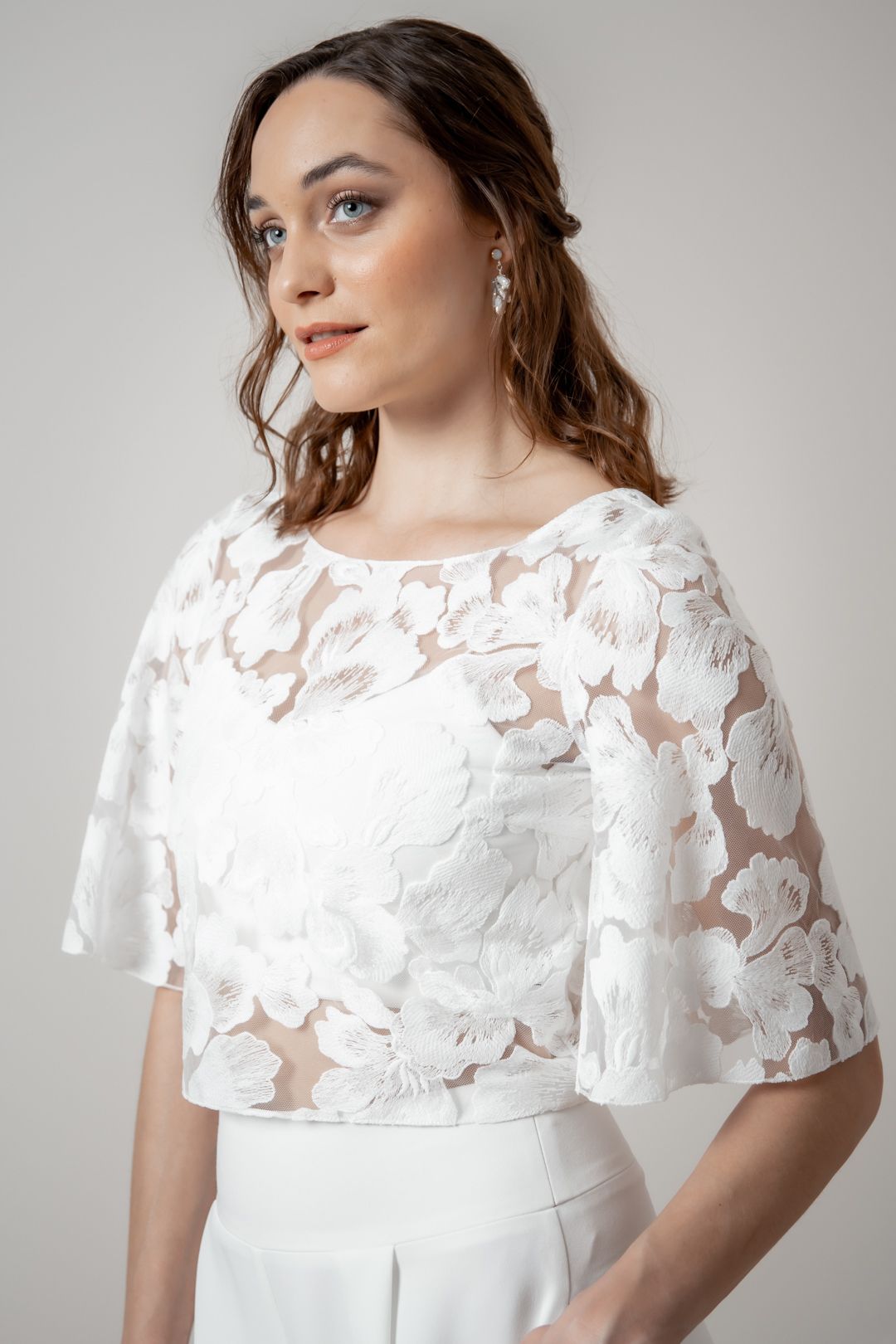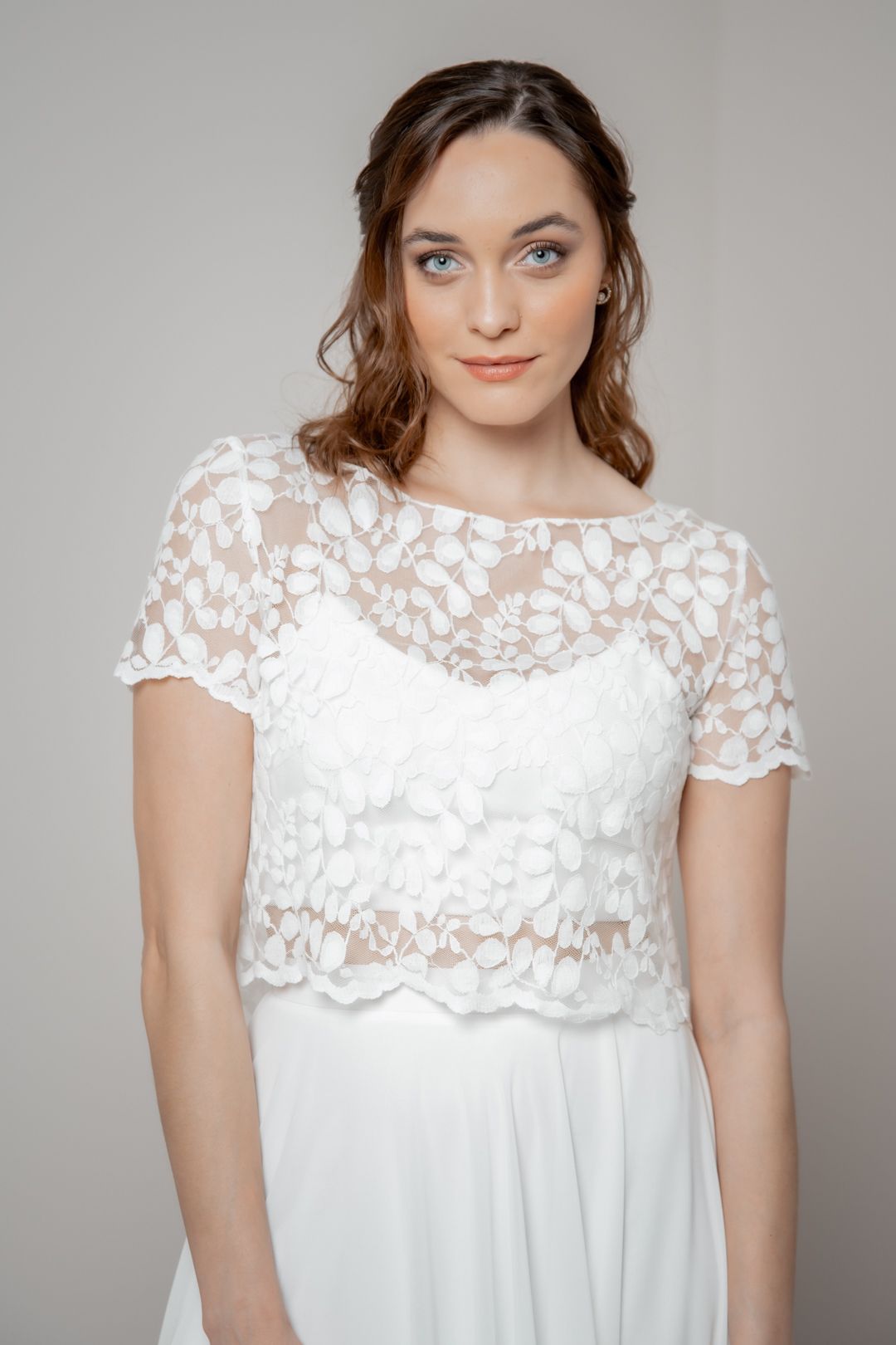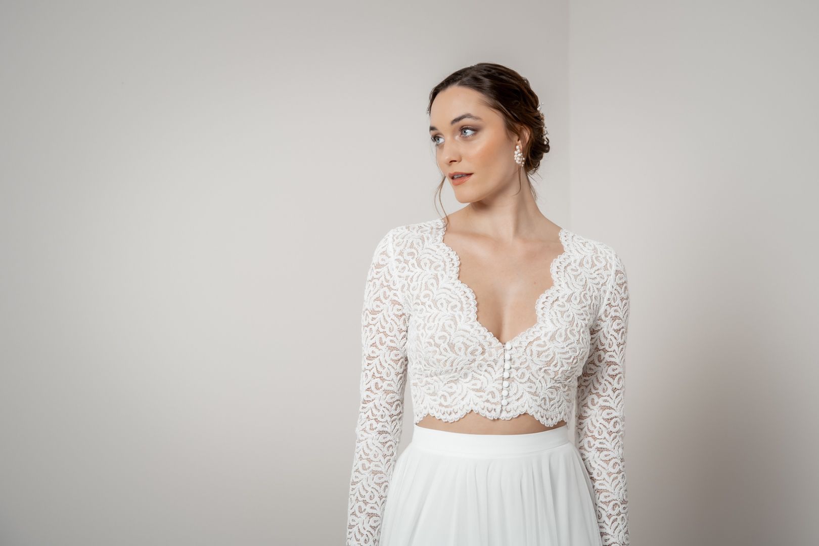 If you want to cover your shoulders in church or in the cooler evenings without resorting to a classic bolero or bridal jacket, then our noni bridal tops may be just the thing for you. Simply put on and taken off again, they give you a completely new look in no time and turn a simple wedding dress into a romantic two-piece wedding dress.