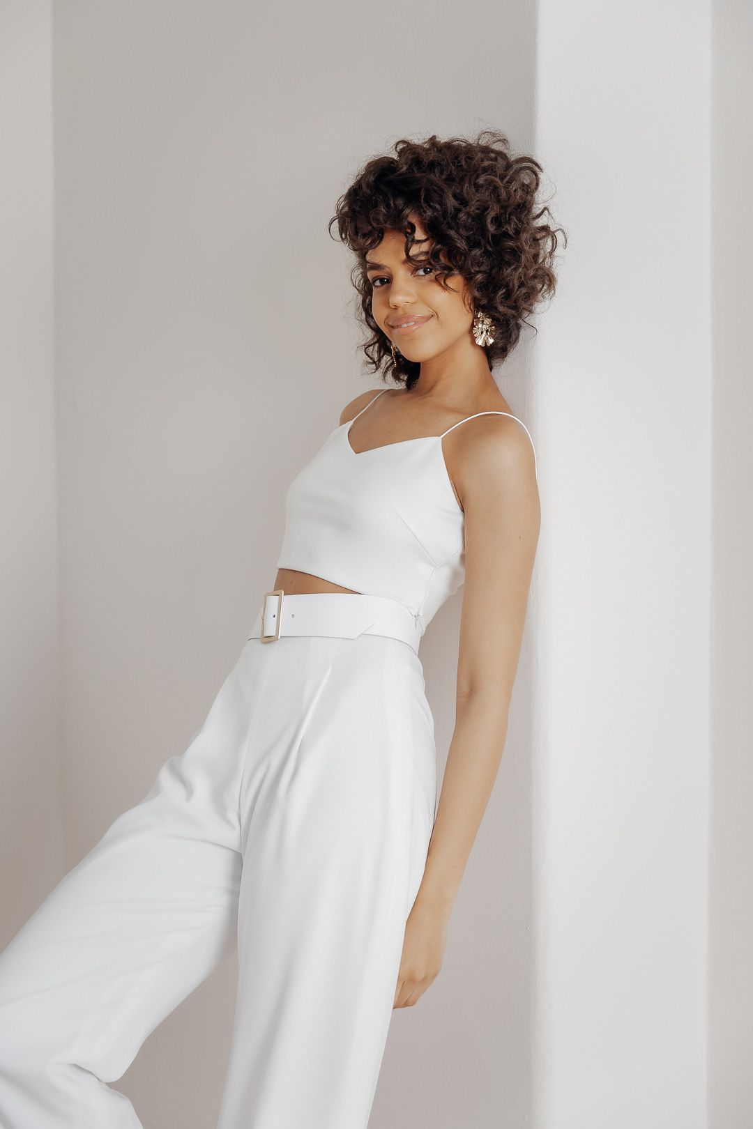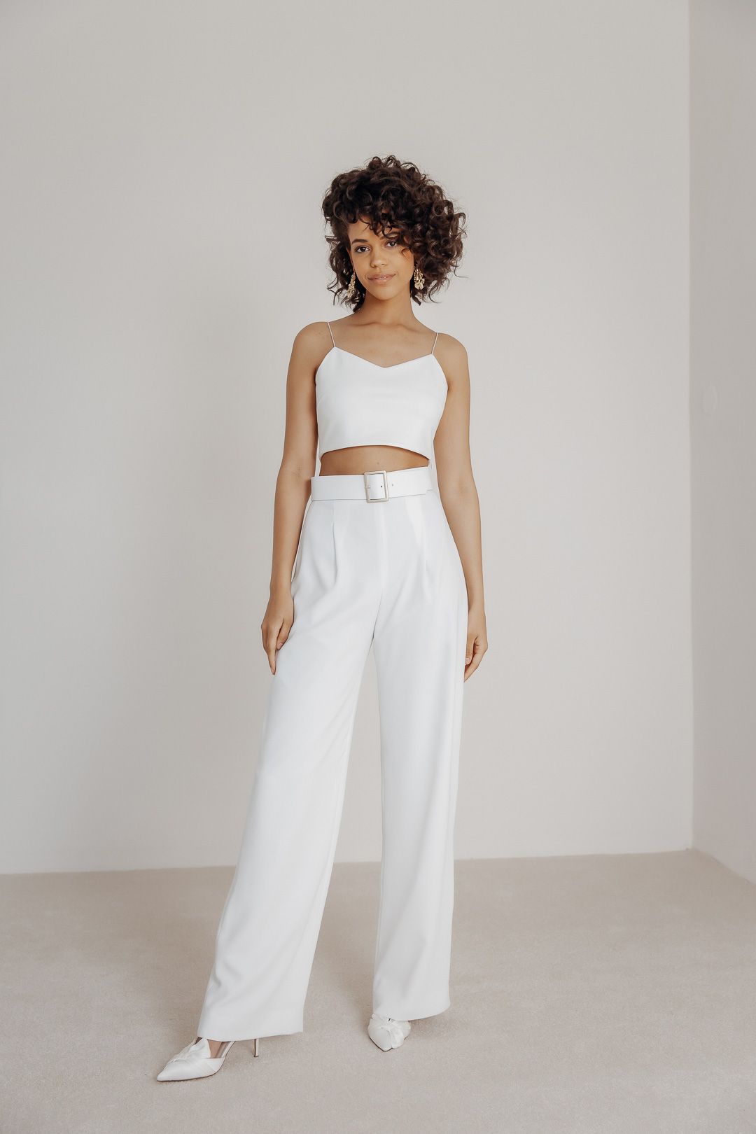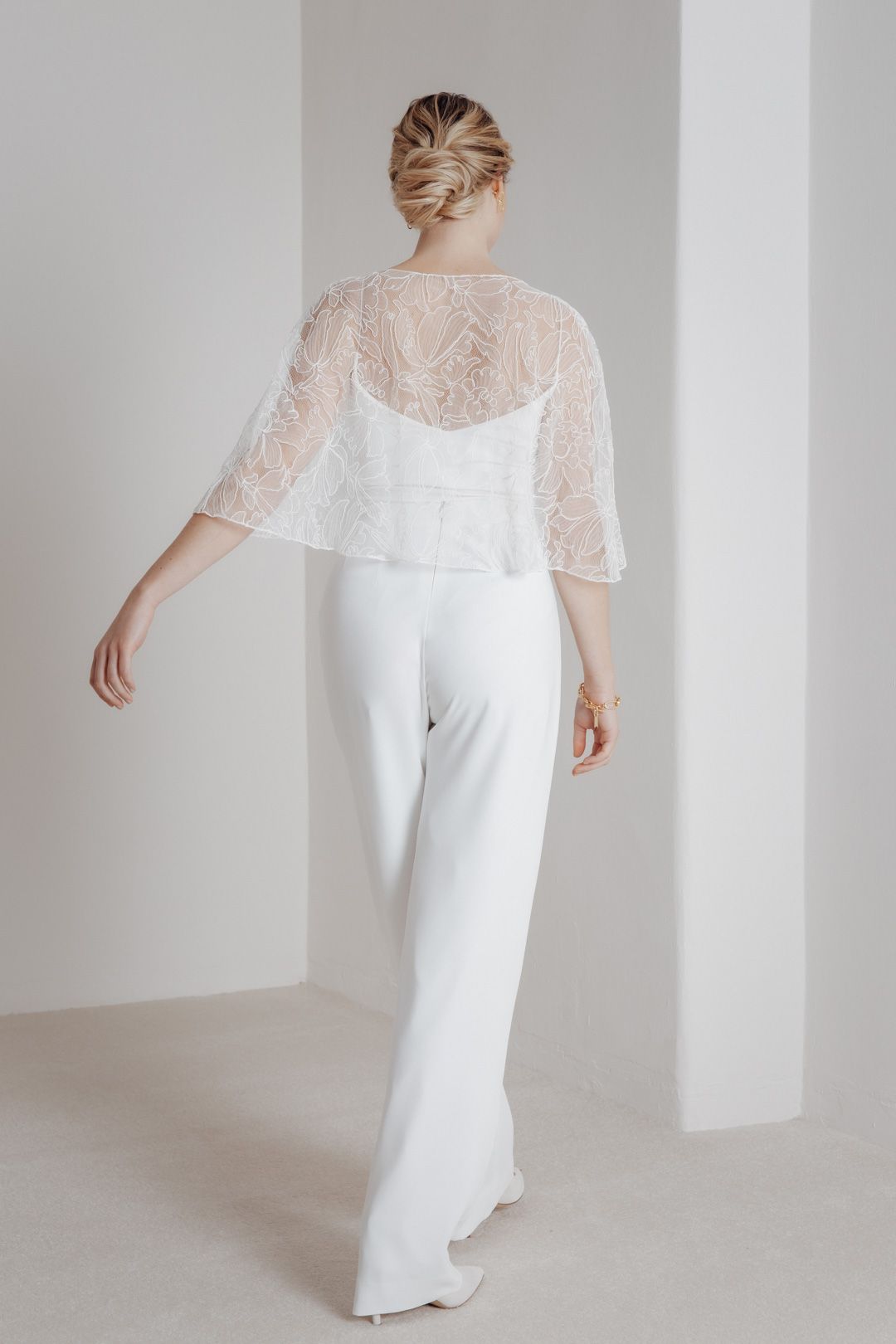 Auch für Bräute, die auf der Suche nach einer Alternative zum klassischen Hochzeitskleid sind: die Tihana-Braut Hose aus 100% umweltfreundlichen, recycelten Materialien sorgt für einen eleganten, unkomplizierten Look.
