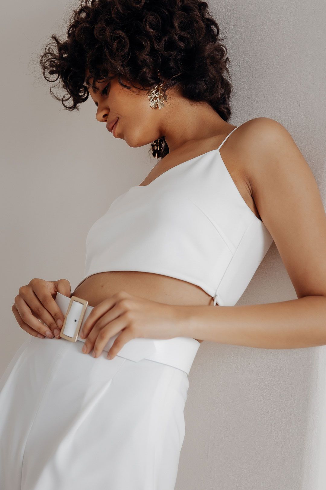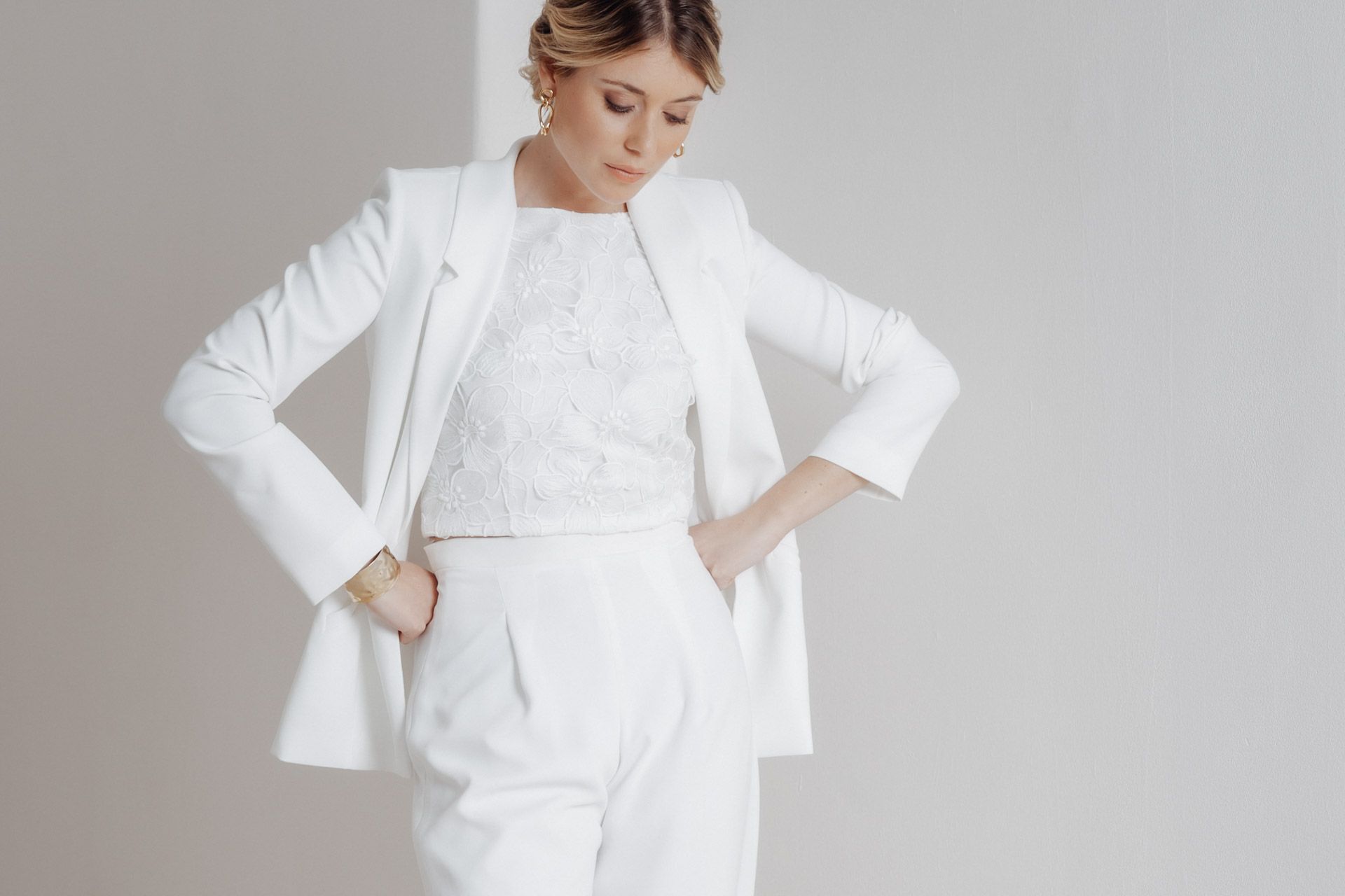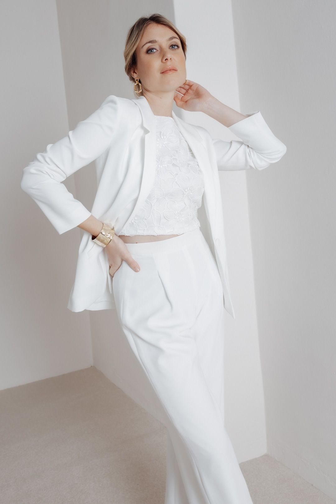 Mit einem Braut Top, Body oder Pullover und dem Enoa-Blazer stellst du dir ein individuelles Standesamt-Outfit zusammen.