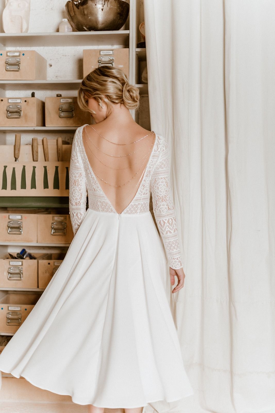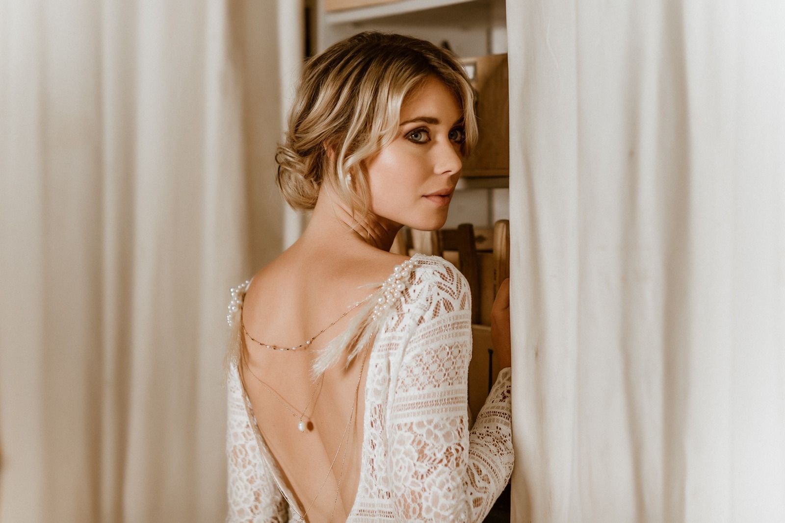 Auch unsere neue Shelly ist mit einem sinnlichen, tiefen Rückenausschnitt versehen, doch dieses Mal besteht das Oberteil aus der beliebten Boho-Spitze, wie du sie beispielsweise auch schon im Violet-Body oder dem Mailenn-Braut Top findest.
