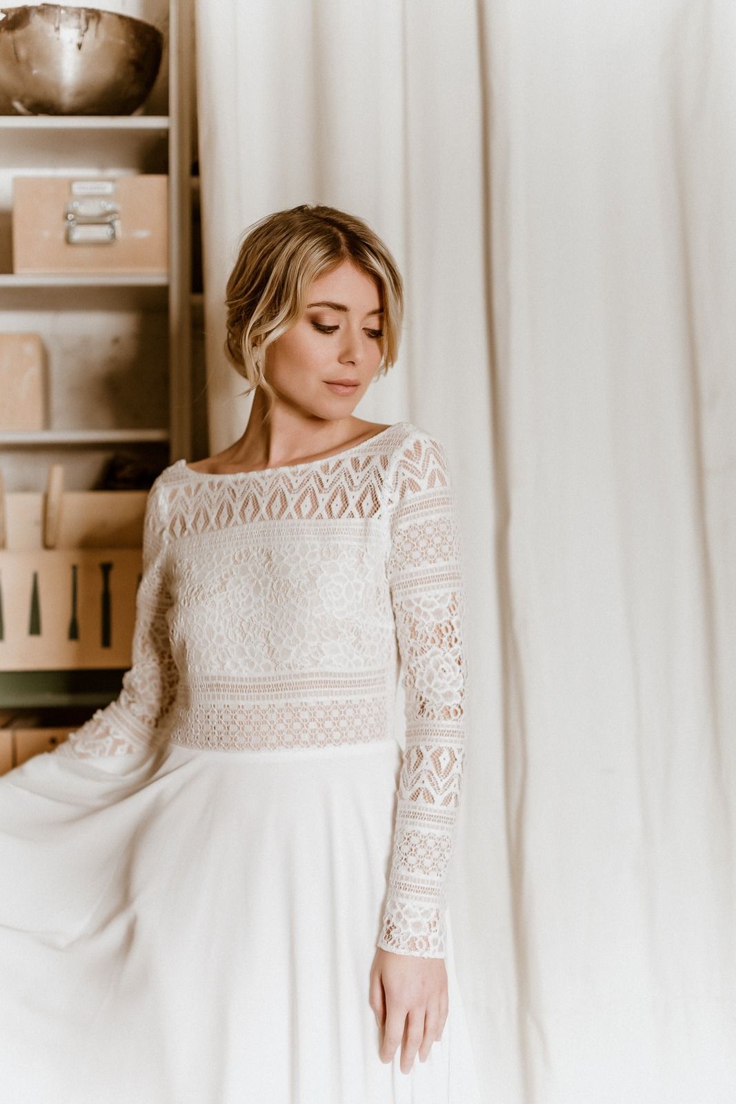 Das abwechslungsreiche Spitzenmuster ist in Kombination mit dem freien Rücken und dem zauberhaften Rock die perfekte Mischung aus einem sehr femininen und modernen Hochzeitskleid im Boho-Stil.