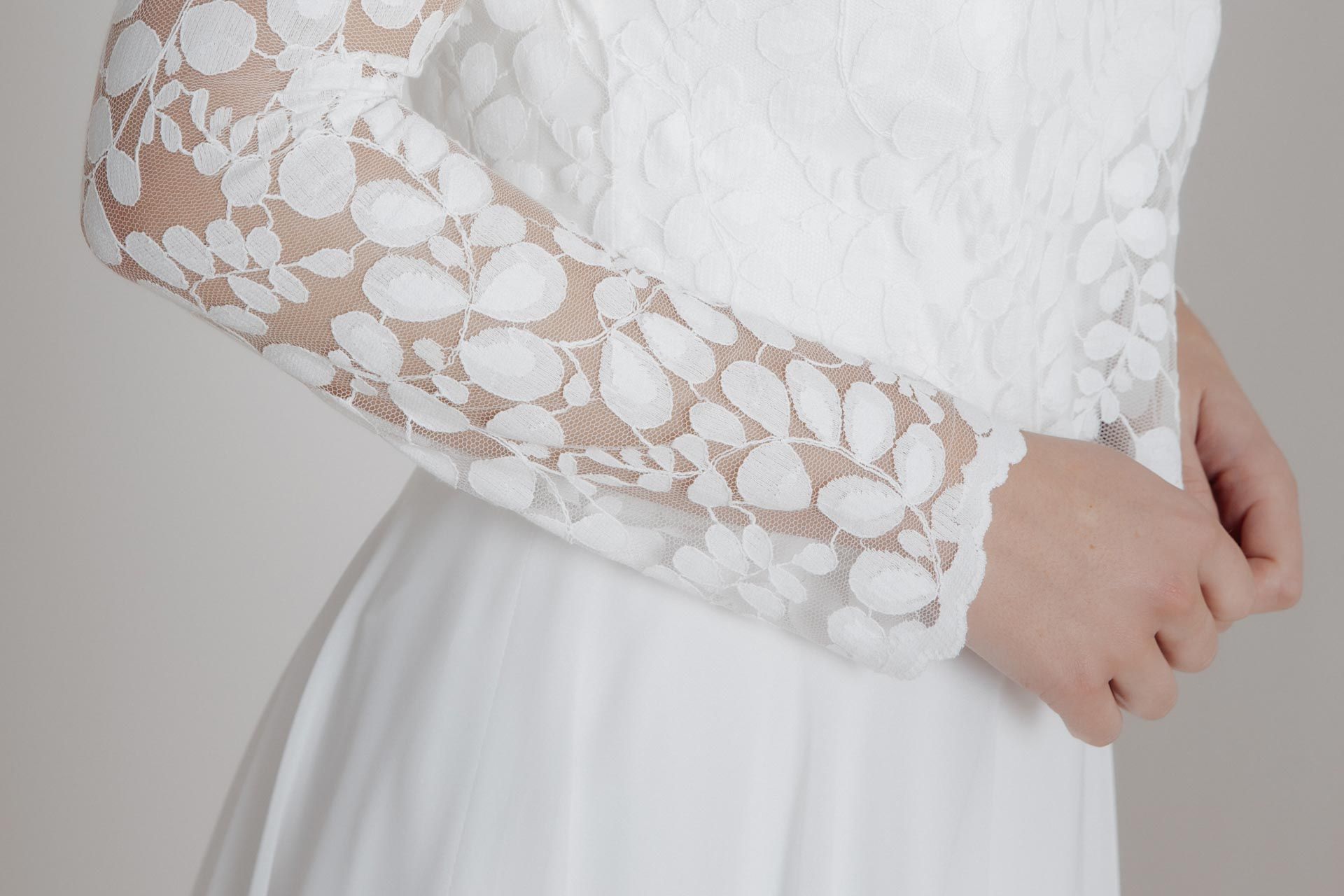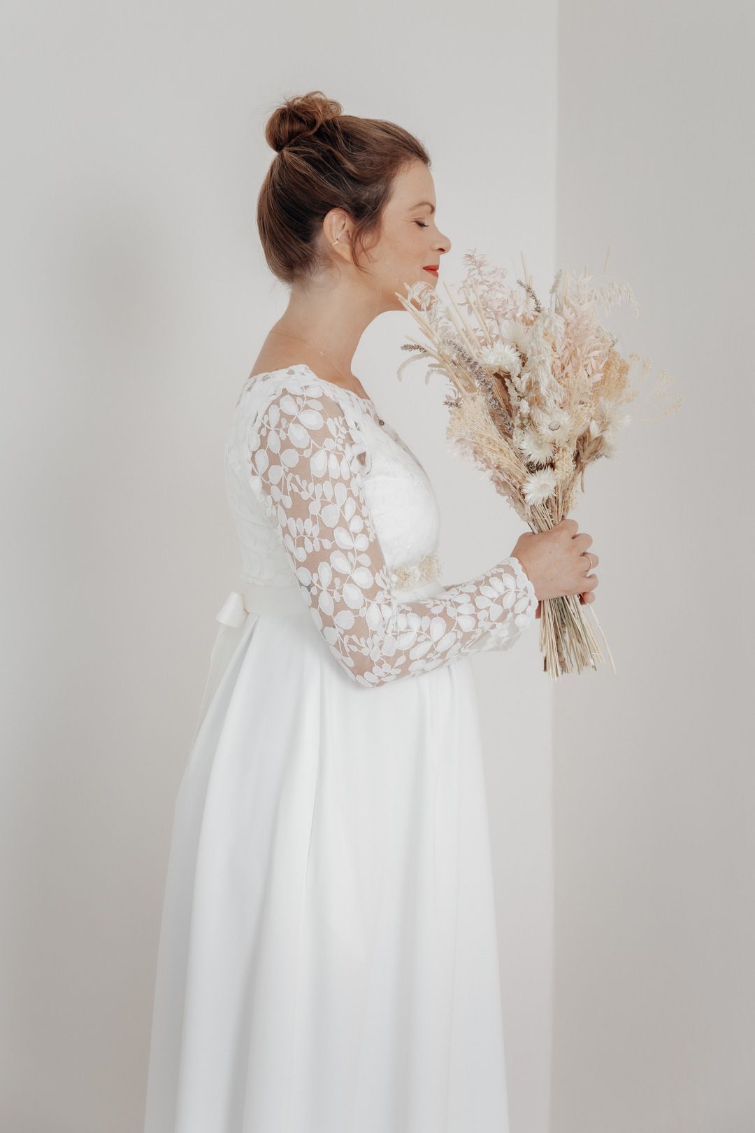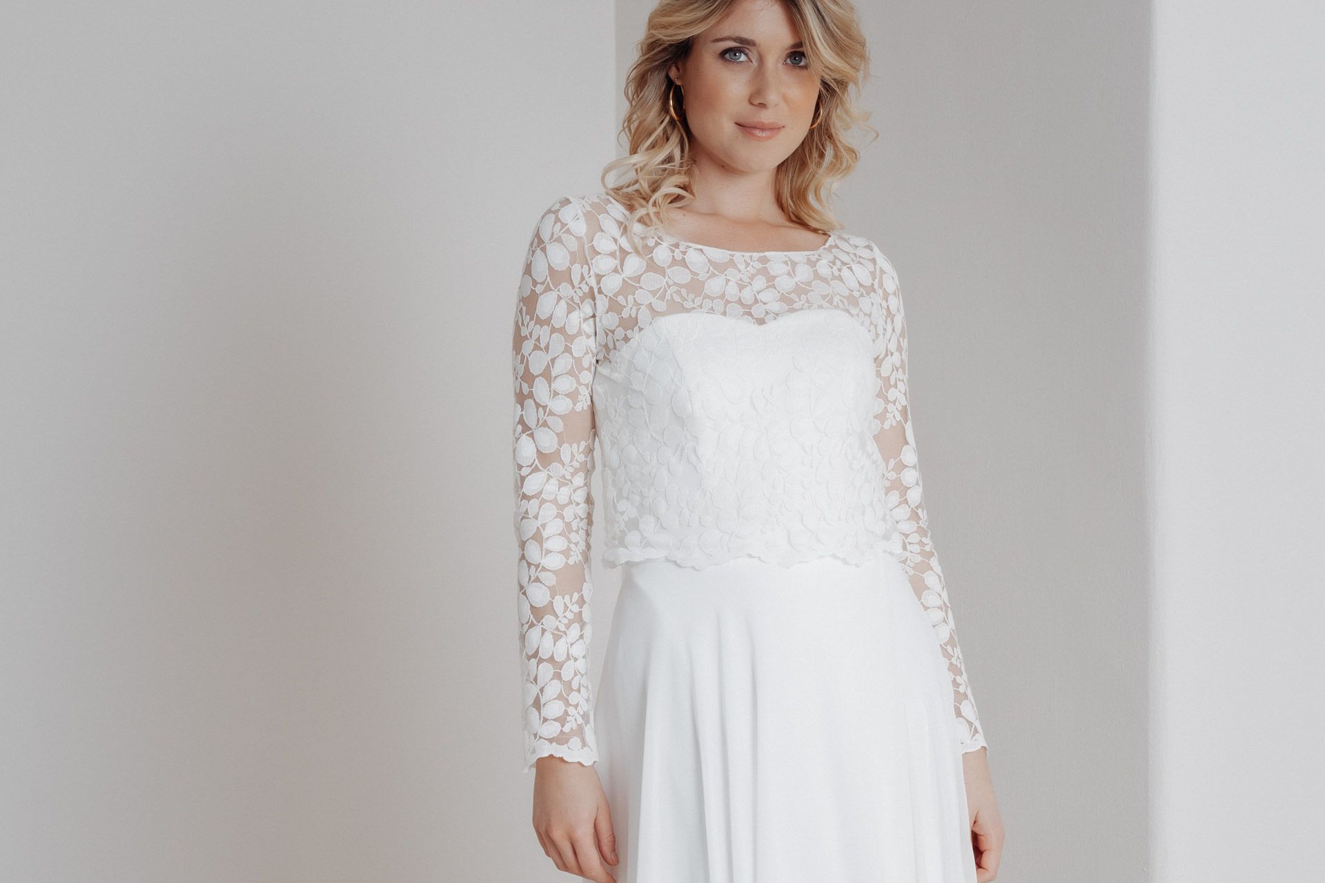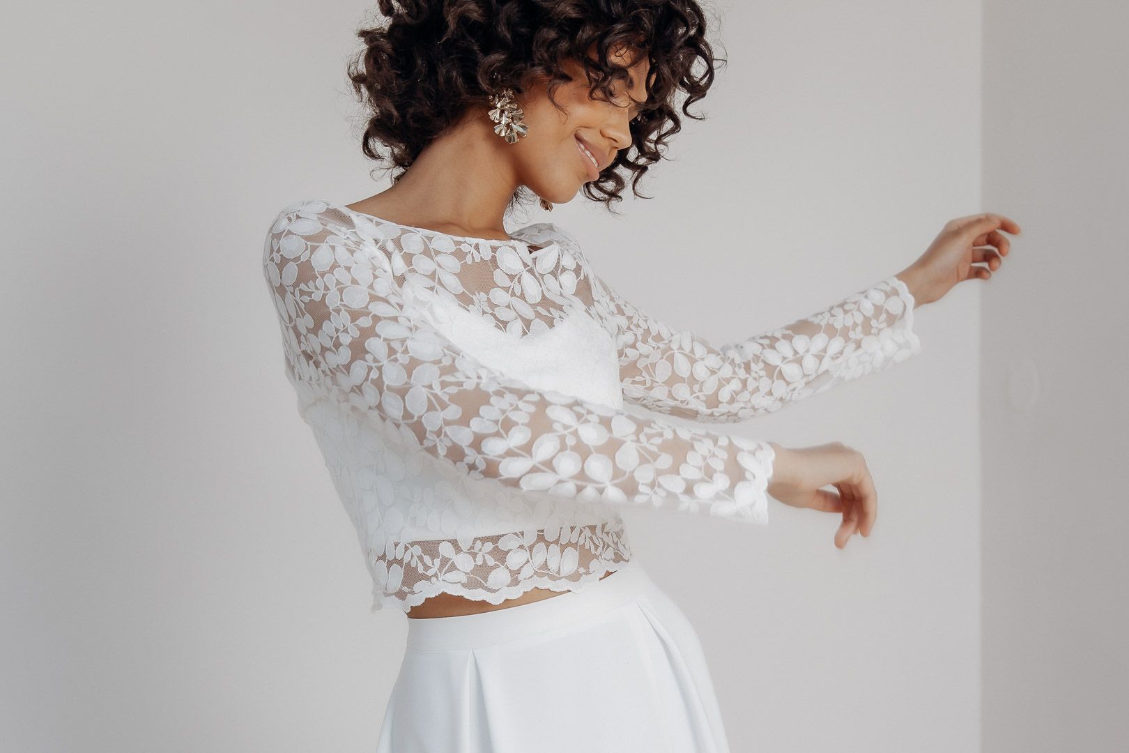 Das Langarm-Top aus Botanik-Spitze kann nicht nur als separates Braut Top getragen werden, sondern eignet sich auch wunderbar als Ergänzung zu vielen verschiedenen einteiligen Brautkleidern oder einem Jumpsuit.